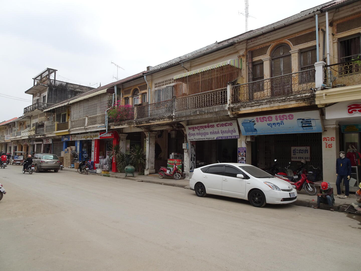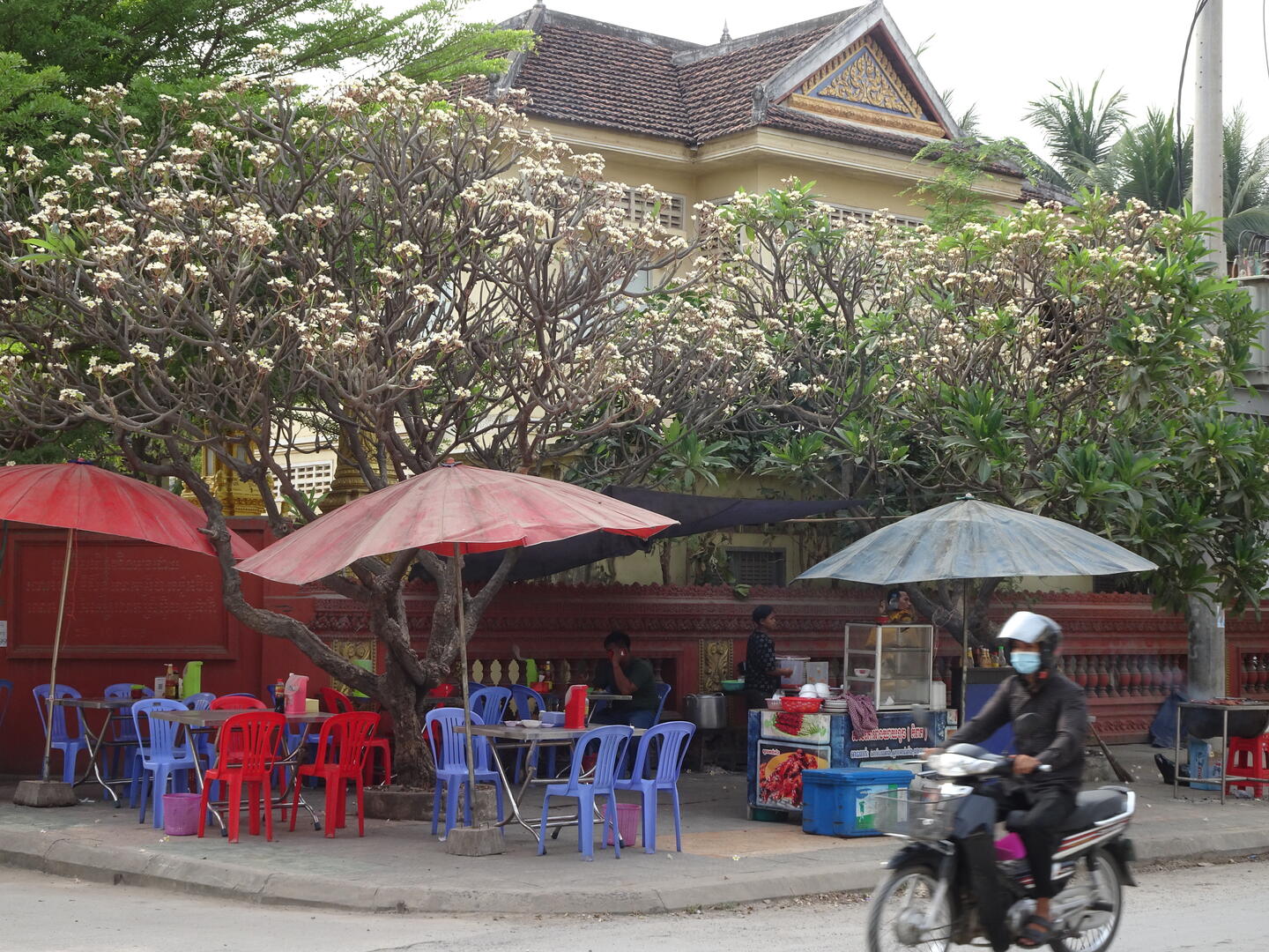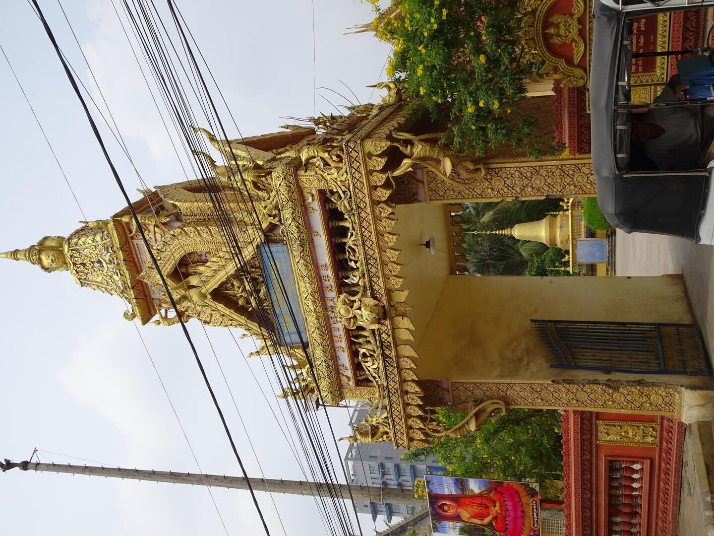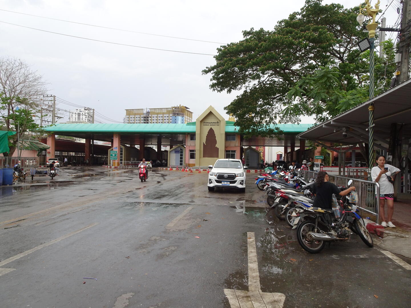 Nach einem ausgiebigen Frühstück in unserem Hotel fuhren wir heute um kurz nach halb acht los. Die Temperatur lag trotz des abendlichen Gewitters bei etwa 27 Grad. Wieder war es die für Kambodscha typische flache Etappe durch trockene, abgeerntete Reisfelder. Nach etwa der Hälfte der heutigen Strecke frischte der Wind auf und wehte uns kräftig ins Gesicht. Dagmar bemühte sich, im Windschatten von Diez zu fahren. Nach anstrengenden 110 Kilometern erreichten wir den Grenzübergang nach Thailand. Dagmar blieb wie immer zunächst bei den Rädern, während Diez als Erster die Grenzformalitäten absolvierte. Wir hatten schon länger den Himmel beobachtet und nun zogen binnen Minuten dunkle Wolken auf. Schon nach dem ersten Blitz fielen dicke Tropfen und wir stellten uns und unsere Räder unter einem Dach unter. Der Wolkenbruch dauerte zum Glück nicht lange und wir konnten unsere Fahrt bald fortsetzen. Während Dagmar im Abfertigungsgebäude war, montierte Diez die Rückspiegel wieder auf die rechte Seite. Nach Laos, Vietnam und Kambodscha haben wir in Thailand wieder Linksverkehr. Wir staunen selbst darüber, wie schnell wir uns inzwischen den jeweiligen Verhältnissen anpassen.