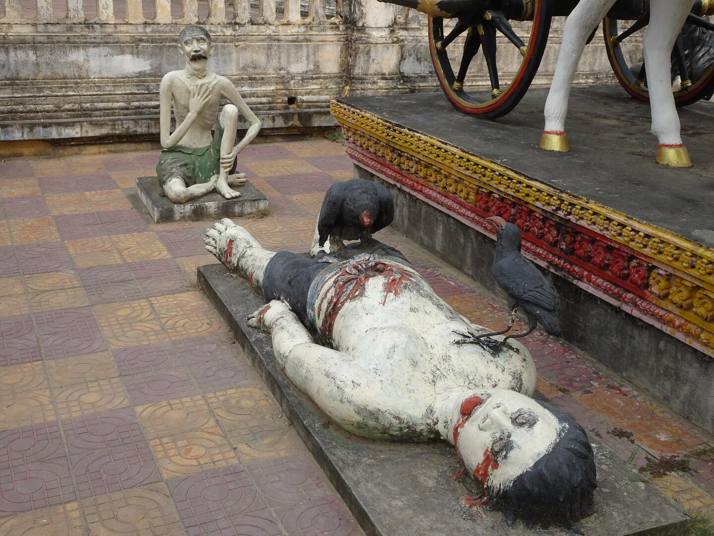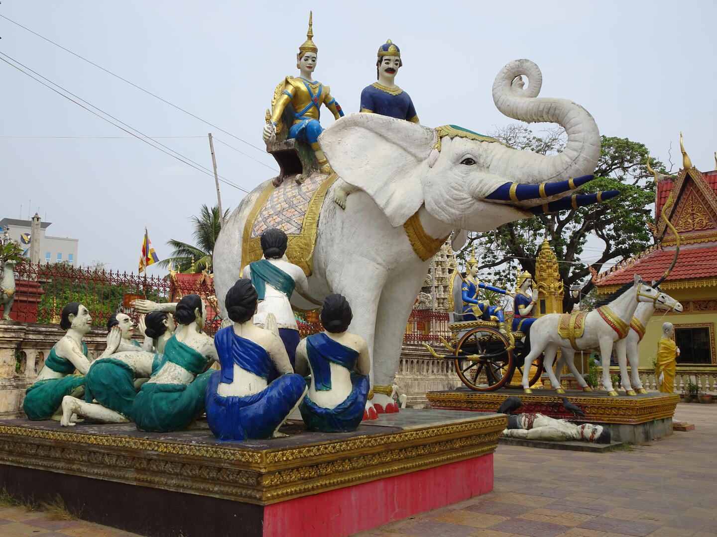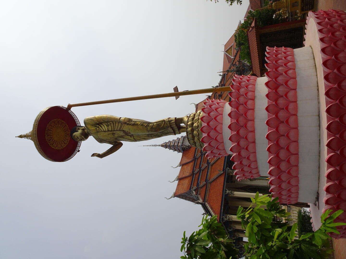 Nach einem ausgiebigen Frühstück in unserem Hotel fuhren wir heute um kurz nach halb acht los. Die Temperatur lag trotz des abendlichen Gewitters bei etwa 27 Grad. Wieder war es die für Kambodscha typische flache Etappe durch trockene, abgeerntete Reisfelder. Nach etwa der Hälfte der heutigen Strecke frischte der Wind auf und wehte uns kräftig ins Gesicht. Dagmar bemühte sich, im Windschatten von Diez zu fahren. Nach anstrengenden 110 Kilometern erreichten wir den Grenzübergang nach Thailand. Dagmar blieb wie immer zunächst bei den Rädern, während Diez als Erster die Grenzformalitäten absolvierte. Wir hatten schon länger den Himmel beobachtet und nun zogen binnen Minuten dunkle Wolken auf. Schon nach dem ersten Blitz fielen dicke Tropfen und wir stellten uns und unsere Räder unter einem Dach unter. Der Wolkenbruch dauerte zum Glück nicht lange und wir konnten unsere Fahrt bald fortsetzen. Während Dagmar im Abfertigungsgebäude war, montierte Diez die Rückspiegel wieder auf die rechte Seite. Nach Laos, Vietnam und Kambodscha haben wir in Thailand wieder Linksverkehr. Wir staunen selbst darüber, wie schnell wir uns inzwischen den jeweiligen Verhältnissen anpassen.