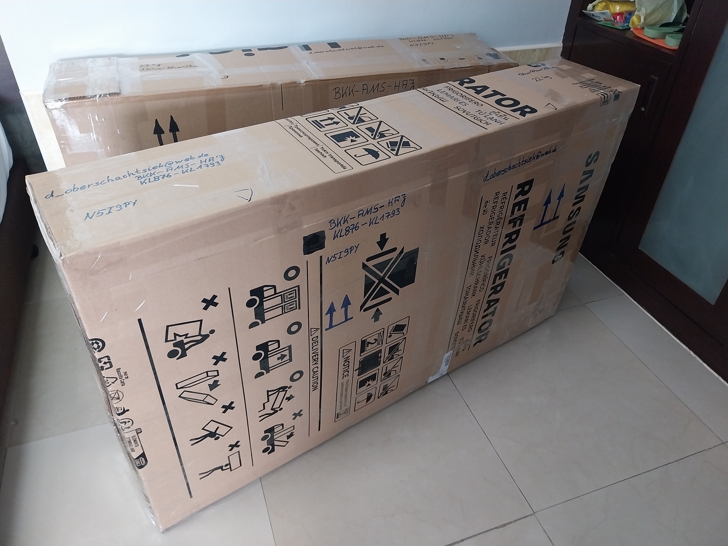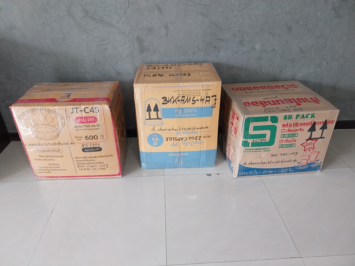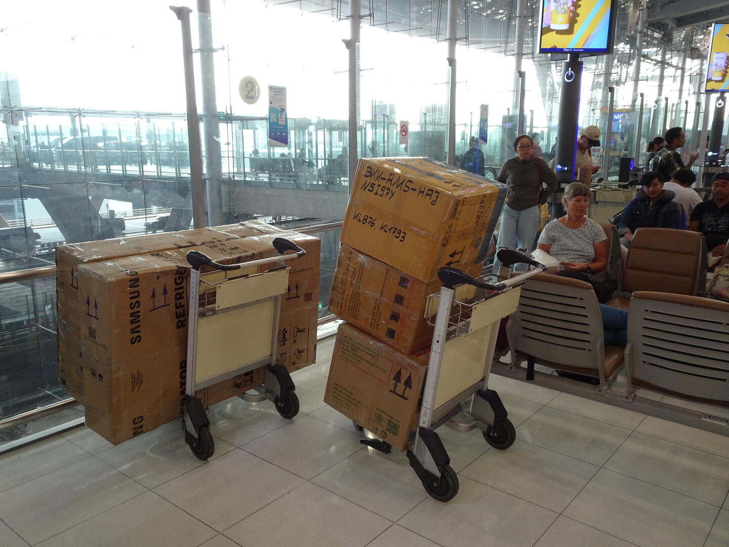 Für die Fahrräder war es die siebte Flugreise. Bisher war ein verbogenes Kettenblatt der einzige Schaden, der dabei aufgetreten ist. Damit das so bleibt, verpacken wir die Fahrräder sorgfältig in auf Maß gebrachten, stabilen Wellpappe-Boxen. Wir hatten in der Vergangenheit bereits mehrere Tage aufwenden müssen, um geeignete Wellpappekartons zu finden, aus denen sich dann die Kartons bauen ließen. Besonders kritisch gestaltete sich die Suche nach ausreichend großen Kartons in Ländern, in denen ständig eine Armada von Sammlern durch die Straßen zieht und jedes Wellpappestück einsammelt. Diesmal hatten wir mehr Glück. Bereits im zweiten Laden den wir am Tag nach unserer Ankunft in Nakhon Pathom aufsuchten, bekamen wir ausreichend große Kartons. Damit war der Zeitraum, den wir für das Verpacken benötigten, überschaubar und wir konnten einen Flug buchen und eine Wohnung in Hannover mieten. Wie üblich war bei der Suche nach einem geeigneten Flug einige Handarbeit erforderlich, da die Suchmaschinen des Internets keine Möglichkeit bieten, die oft entscheidenden Kosten für Über- bzw. Sportgepäck zu berücksichtigen. Bei KLM wurden wir fündig und konnten für den 11. April zwei der vier für einige Zeit letzten freien Plätze buchen. Fluggesellschaften reduzieren, bis auch der letzte Platz besetzt ist, kontinuierlich den Flugpreis. Nur so können wir uns erklären, dass KLM, die wir nicht als Billigfluglinie kennen, den attraktivsten Preis bot. Nicht nur, dass Sportgepäck für lediglich 100 € transportiert wird, wir hatten mit Amsterdam auch nur einen Zwischenstopp bis Hannover und erwarteten dort einen Aufenthalt von nur 1:20 Stunden statt wie meist bei den Billigfluglinien erheblich länger auf den Anschlussflug warten zu müssen. Drei Kartons für das sonstige Gepäck waren ebenfalls schnell gefunden und darin, wie die Fahrräder demontiert und verpackt werden müssen, haben wir inzwischen Routine.