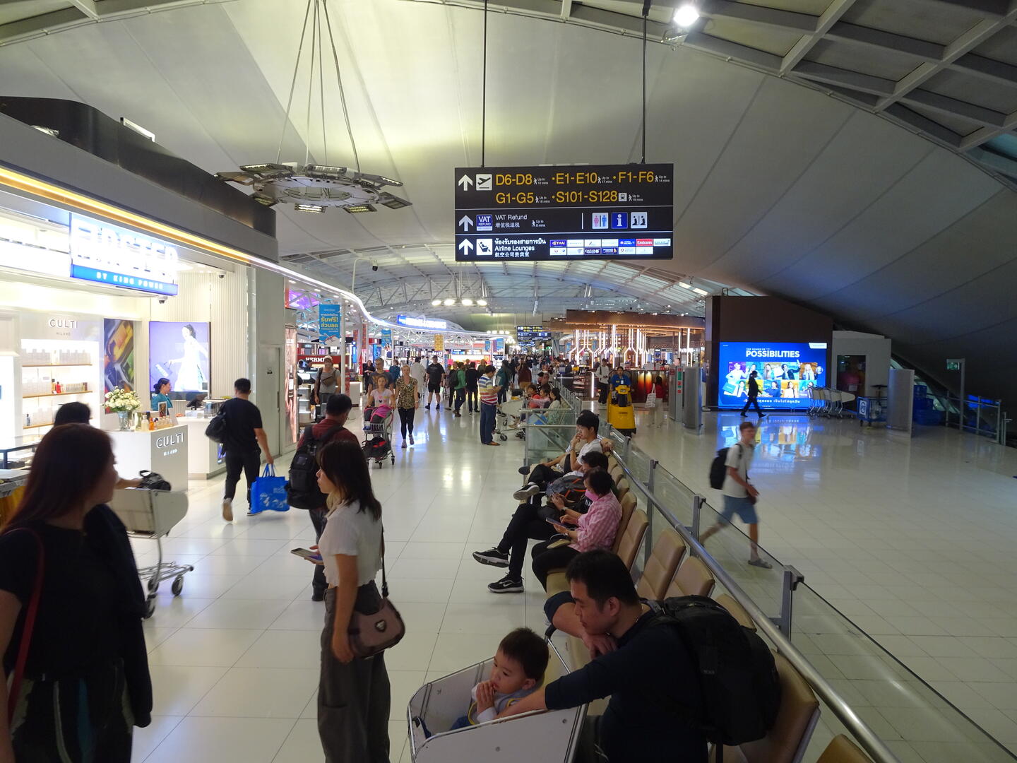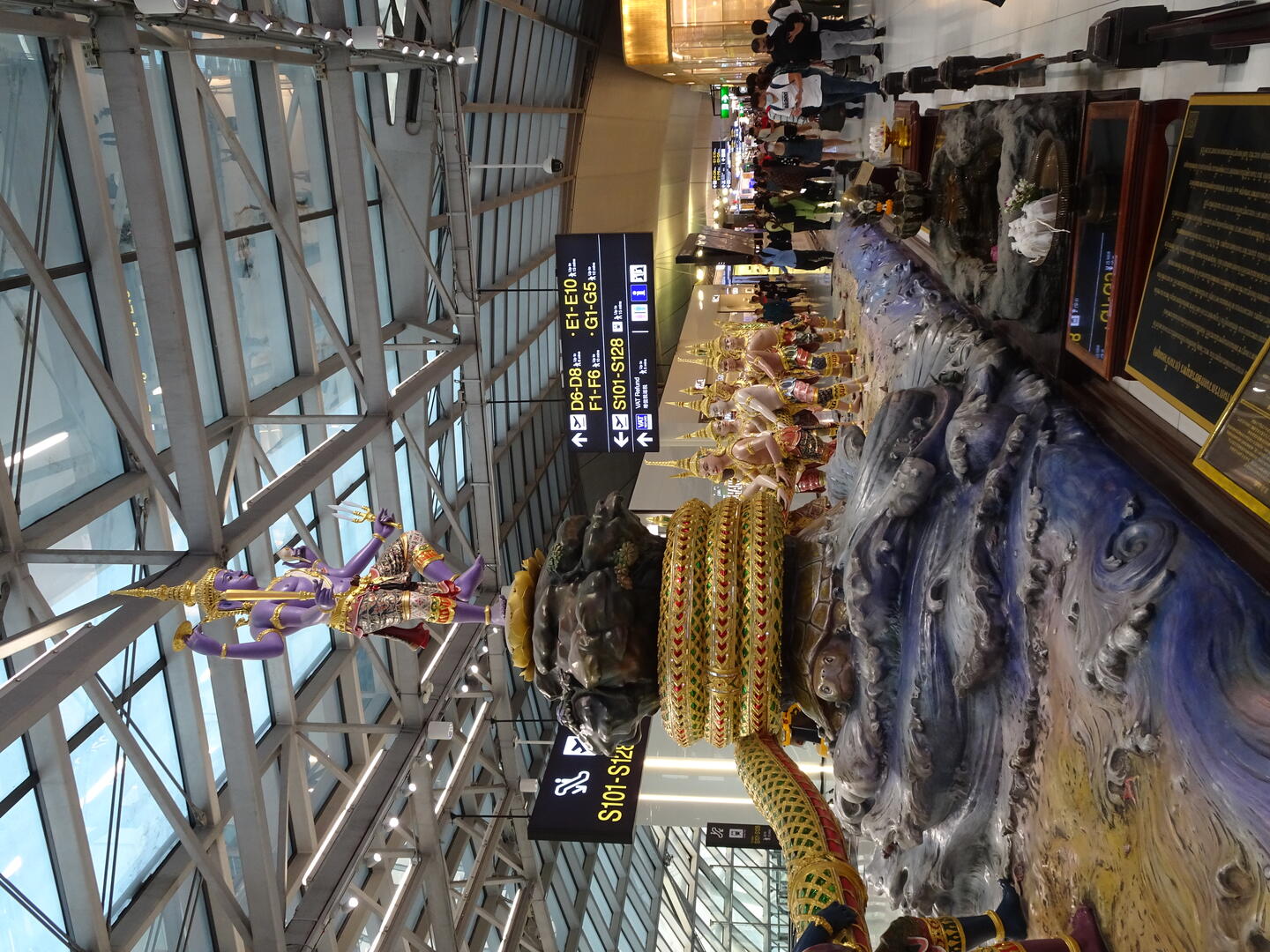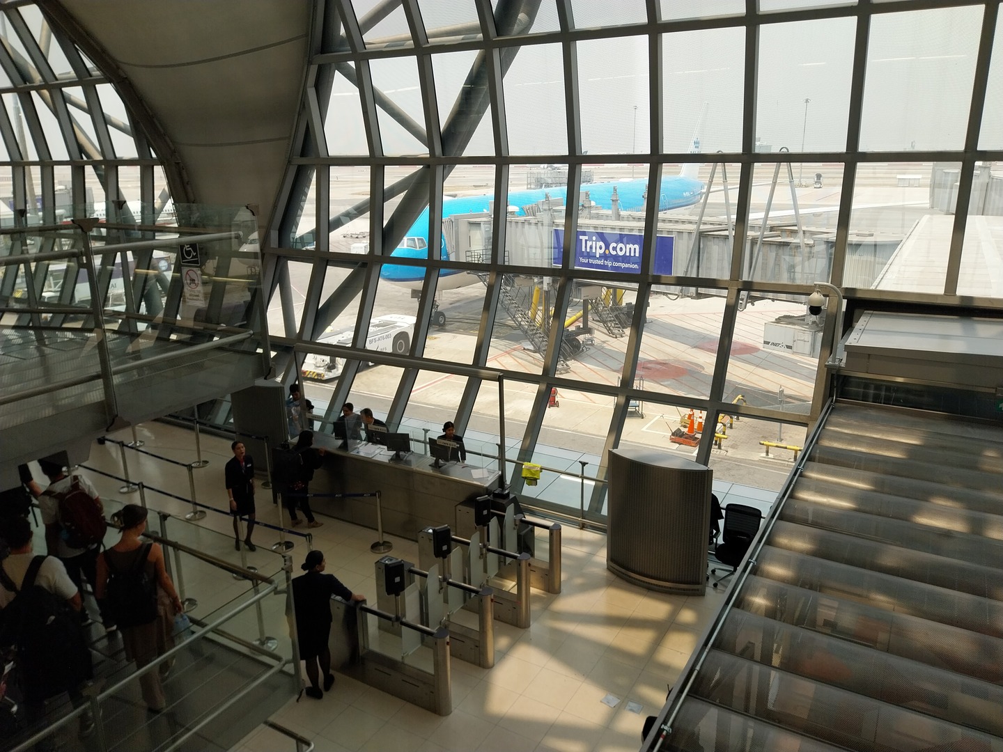 Für die Fahrt zum auf der anderen Seite von Bangkok liegenden Flughafen reservierten wir einen Pickup mit einem regendichten Aufbau über der Ladefläche. Wegen der unbekannten Fahrzeit planten wir mit einem üppigen Zeitpuffer. Entsprechend früh erreichten wir den Flughafen und konnten direkt nach Öffnung des Check-ins unser Gepäck aufgeben. Alles verlief reibungslos bis wir, bereits im Flugzeug sitzend, informiert wurden, dass ein Passagier nicht mitfliegen würde. Leider hatte er sein Gepäck bereits aufgegeben, das im Frachtraum gefunden und entladen werden musste, bevor wir starten konnten. Dadurch verzögerte sich der Start um 51 Minuten. Das bedeutete, dass sich die Landung in Amsterdam von 19:15 Uhr auf 20:06 Uhr verschieben würde und uns bis zum Schließen des Gates vom Anschlussflug um 20:20 Uhr nur 14 Minuten bleiben würden.