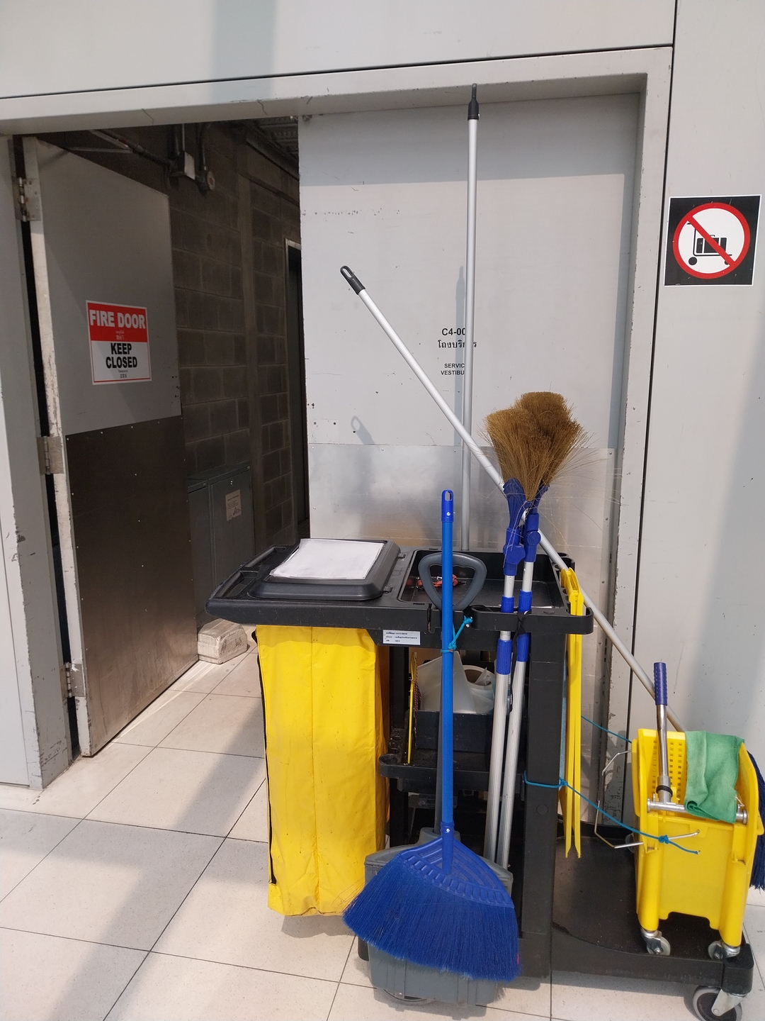 Wenn schon ein Flügel der Fluchttür blockiert ist, stellt man wenigstens sicher, dass der andere Flügel der Feuerschutztür offen ist