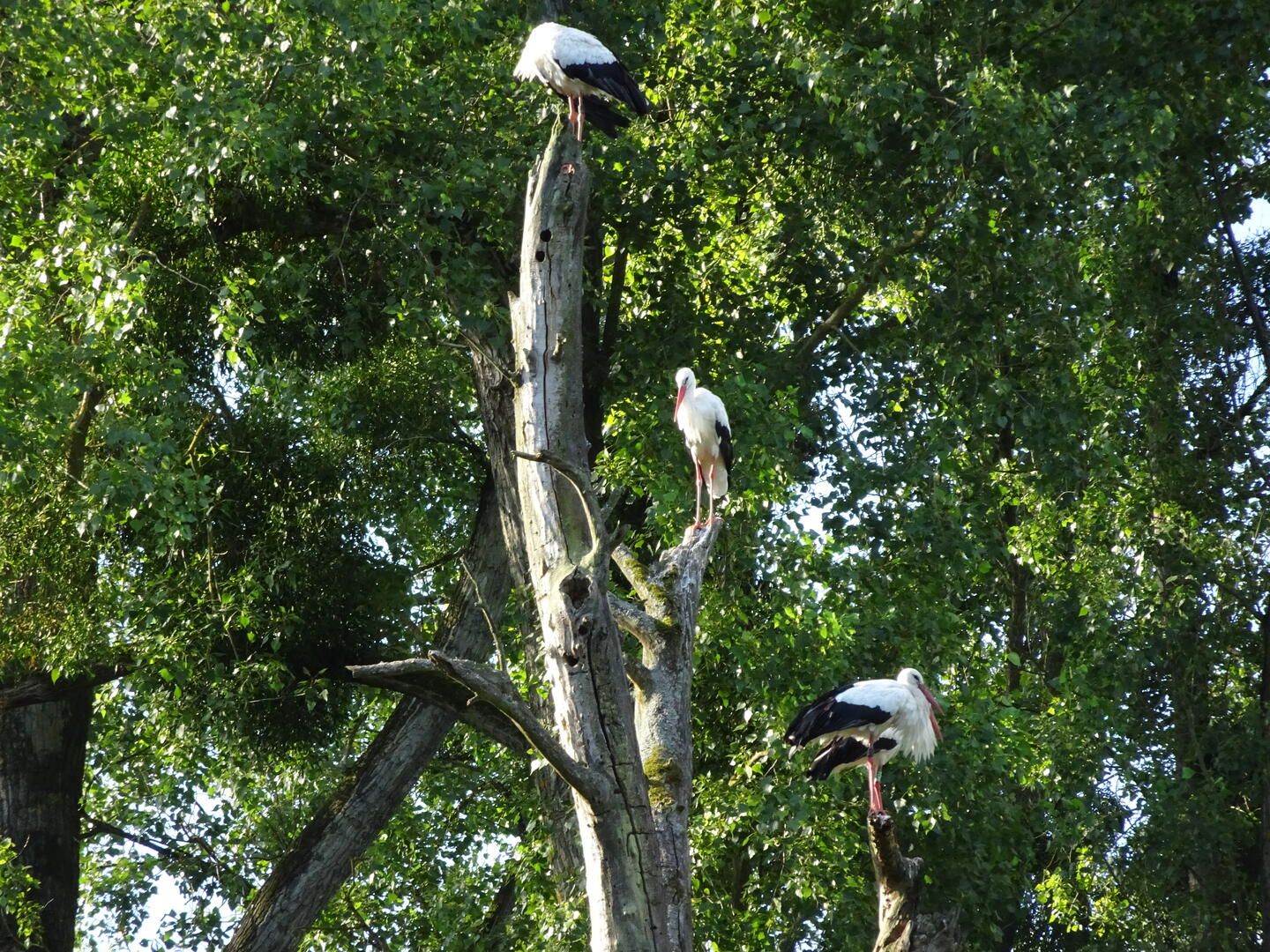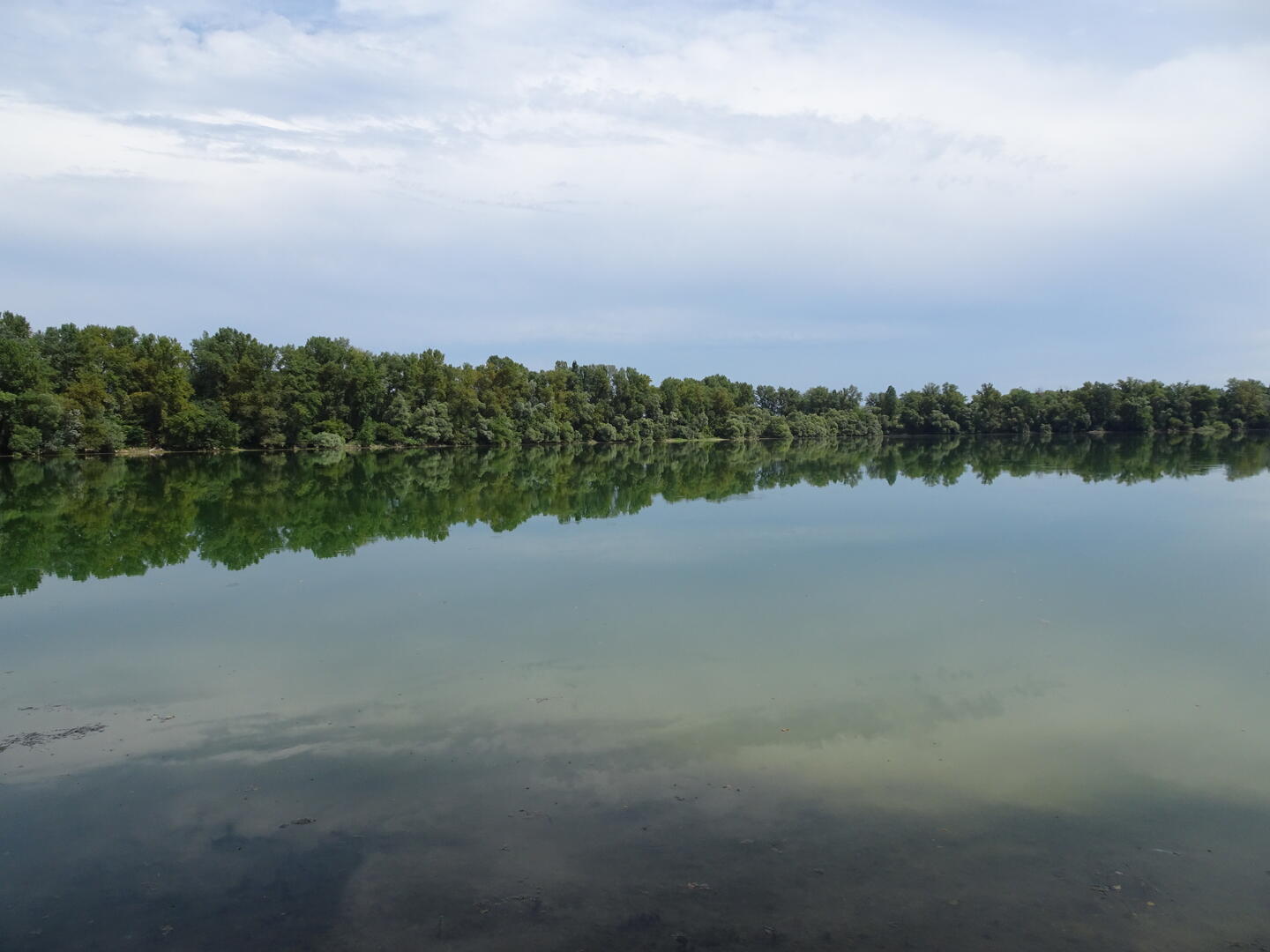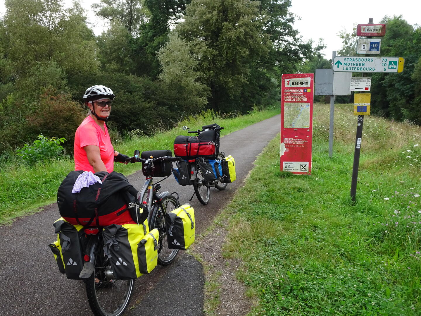 Wir hatten uns nach unserem Ruhetag am Sonntag gut vorbereitet und konnten schon um 7:10 Uhr losfahren. Nach wenigen Kilometern erreichten wir Germersheim, wo wir wieder auf unsere ursprünglich geplante Strecke trafen. Wir fuhren auf dem Hauptdeich des Rheins, sahen den Fluss aber selten, da die Rheinaue dicht mit hohen Bäumen und Büschen bewachsen ist. Gegen halb zehn verdunkelte sich der Himmel. Wir waren unsicher, ob wir uns unterstellen oder riskieren sollten, nass zu werden. Wir stellten uns bei einem Einkaufsmarkt unter und nutzen die Pause zu einem zweiten Frühstück mit einigen Brezeln. Die Entscheidung, weiterzufahren, erwies sich als richtig, denn es begann nur leicht zu regnen und wir hatten das Regengebiet verlassen, lange bevor wir durchnässt waren. Nach etwa 44 km erreichten wir die unspektakuläre Grenze nach Frankreich. Hier verläuft der Fahrradweg öfter abseits vom Autoverkehr durch ein Gebiet, was sich anscheinend weitgehend selbst überlassen wird. Wir sahen an einer Stelle 22 Störche, die sich vermutlich zum Flug in den Süden sammeln. Ein großer Schwarm Gänse hatte wahrscheinlich ähnliches vor und auch die Stare werden wohl bald aufbrechen. Nach etwa 95 km fanden wir ein gutes Hotel mit einem ausgezeichneten Restaurant. Von hier aus wollen wir morgen Straßburg besuchen.