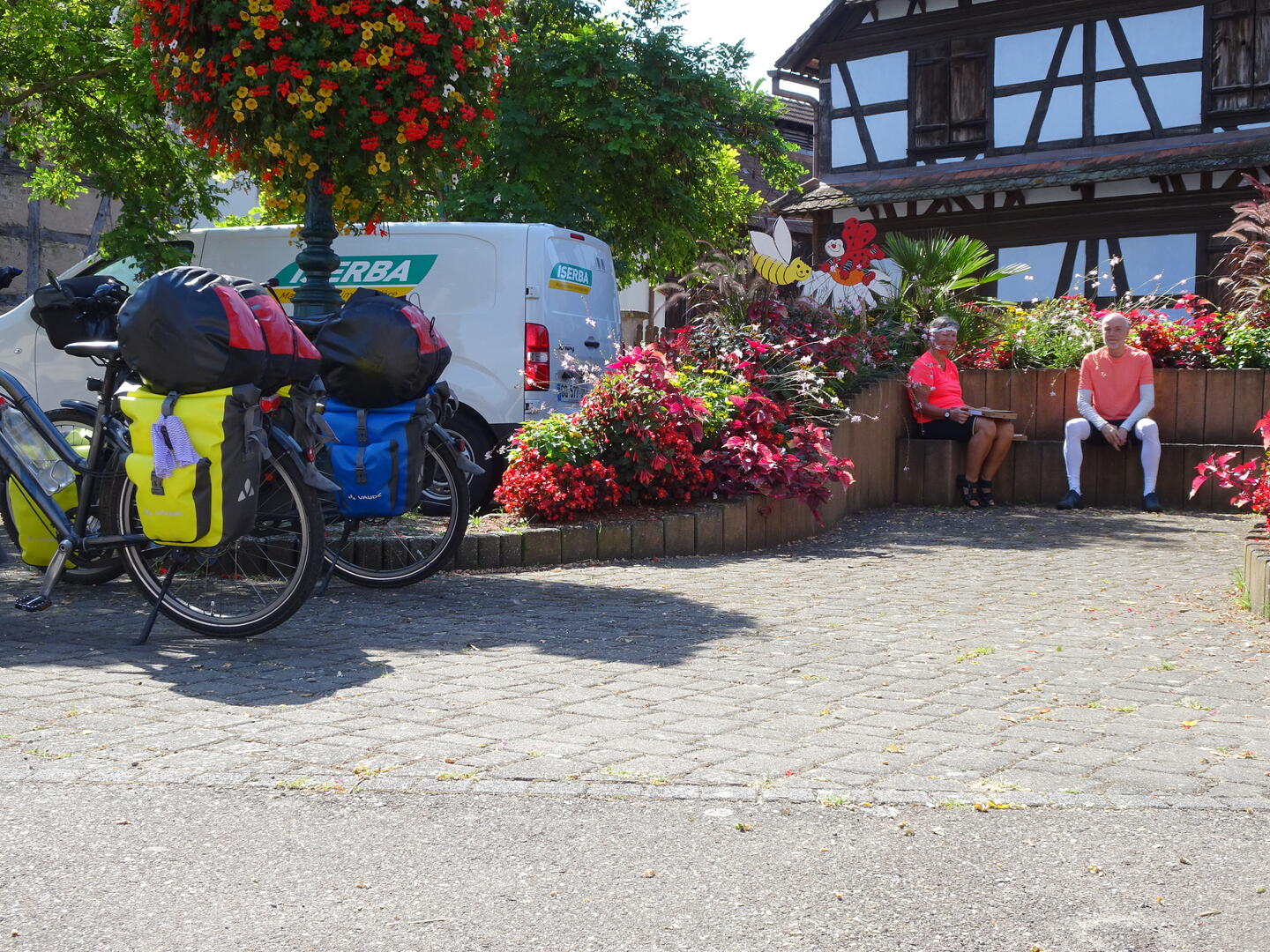 Kurz hinter Straßburg hielt die Etappe noch eine Überraschung für uns bereit. Der Weg verlief entlang des Rhein-Rhône-Kanals. Wir fühlten uns an die schönen Radwege entland des Canal latéral à la Garonne und des Canal du Midi erinnert. Gesäumt von riesigen Platanen, abseits jeglichen Autoverkehrs und mit einem für den Kanal optimierten Höhenprofil ist der Weg entlang des Rhein-Rhône-Kanals ein Paradies für Radfahrer. Dem Kanal konnten wir etwa 53 km folgen. Verpflegungsmöglichkeiten wie Supermärkte, Bäckereien, Imbisse oder Restaurants hatten wir nicht gefunden, denn der Radweg verläuft abseits der Ortschaften und an Wochentagen haben die wenigen Cafés geschlossen. Wir versuchten unser Glück in einer Ortschaft, die wir vom Radweg des Kanals aus etwas abseits gesehen hatten und fanden einen Pizza Automaten. So etwas hatten wir noch nicht gesehen und waren gespannt auf das Ergebnis. Zu unserer Überraschung spuckte der Automat in weniger als fünf Minuten zwei heiße, schmackhafte und bezahlbare Pizzen auf einem Aluteller im Pappkarton aus. In unmittelbarer Nähe fanden wir einen Sitzplatz und aßen, umrahmt von bunten Sommerblumen unser Mittagessen.