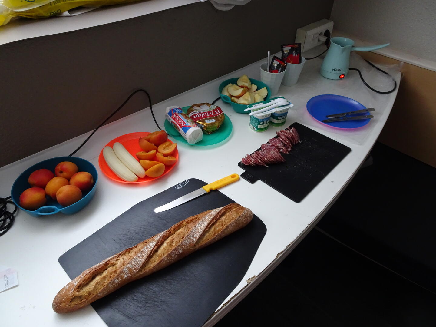 Das gestrige Wetter warf unsere Pläne über den Haufen. Der Himmel war grau und schon wenig später begann es zu regnen. Das Besichtigungsprogramm wurde daher verschoben, da der Wetterbericht für heute Besserung vorhergesagt hatte. Während sich Dagmar um die Wäsche kümmerte, besorgte Diez das Frühstück. Meist verzichten wir auf das Frühstück in den Hotels, denn es ist in der Regel überteuert, Croissants und Milchkaffee sind nicht unser Geschmack und an Fahrtagen wollen wir meist bereits unterwegs sein, bevor wir frühstücken könnten. Deshalb aßen wir auch in Besançon auf unserem Zimmer. Dank unseres kleinen, 2022 in der Türkei gekauften Wasserkochers müssen wir auf Tee oder Kaffee nicht verzichten.