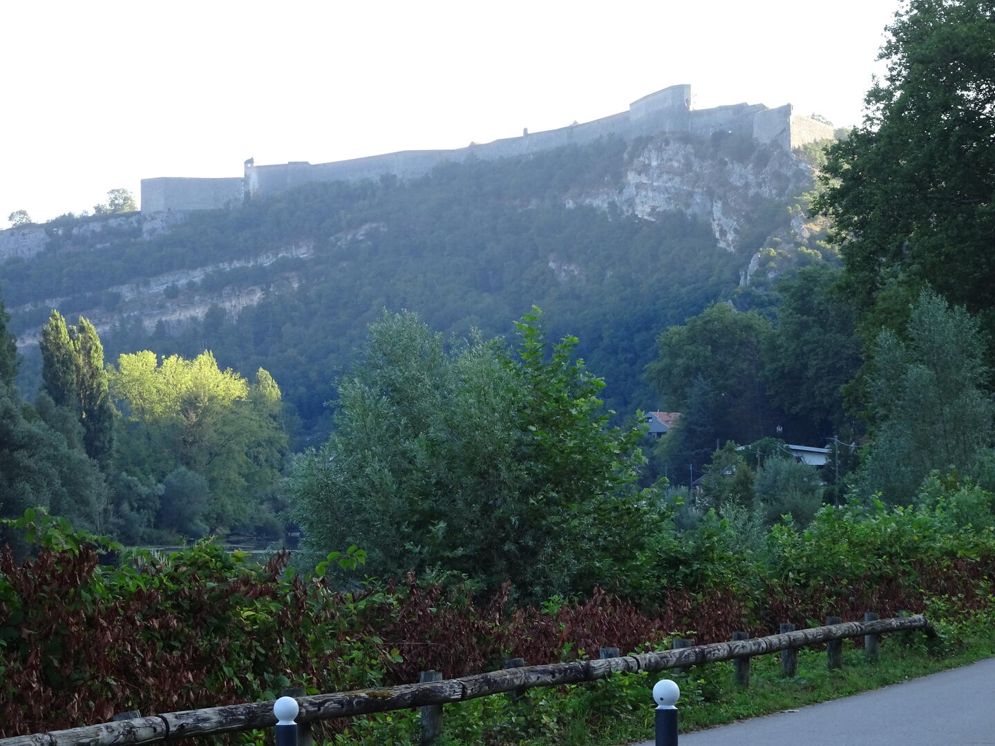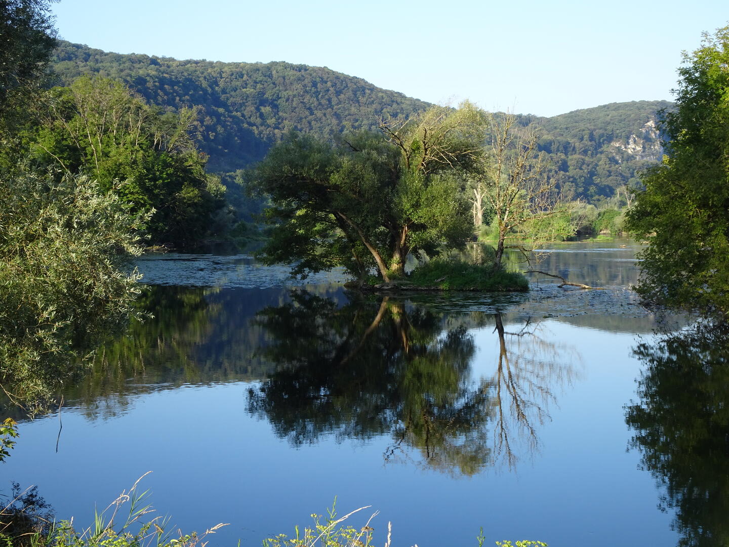 Nur wenige Meter nach unserem Hotel überquerten wir den Doubs. Dem Rhein-Rhône-Kanal, der meist im Tal des Doubs verläuft, folgten wir auch heute. Oft sind die Felswände zu beiden Seiten des Tals beinahe senkrecht. Erneut faszinierten uns die Felsformationen und die Spiegelungen in den morgendlich glatten Oberflächen des Kanals und des Doubs.