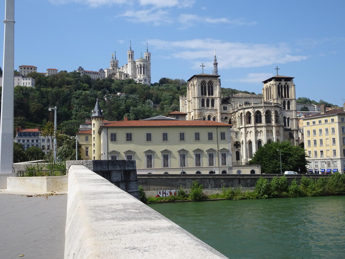 Nach unserem Umzug suchten wir einen Waschsalon auf, in dem wir unsere Wäsche waschen und trocknen konnten. Nachdem auch das erledigt war, besichtigten wir die Highlights der Stadt: Die Kathedrale von Lyon und die Basilika Notre-Dame de Fourvière. Die auf dem Fourvière-Hügel liegende Basilika übertraf mit ihrem Detailreichtum und riesigen Mosaiken unsere Erwartungen. Vom Fourvière-Hügel hatten wir einen guten Blick über große Teile der Stadt. Die Häuser in den Hanglagen auf beiden Seiten des Flusses erinnern in ihrer Anordnung und durch die helle Sandsteinfarbe an Südeuropa.