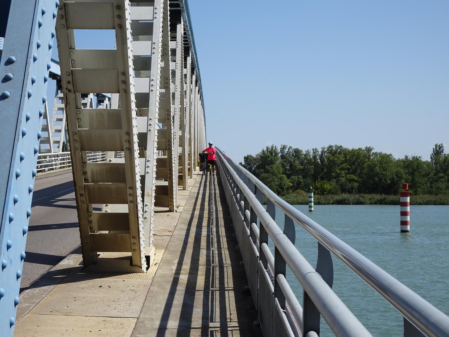 Nach einer ruhigen Nacht in unserem Mobilheim und einem schnellen Frühstück mit Müsli saßen wir früh auf unseren Rädern. Der Campingplatz liegt unmittelbar am Radweg, sodass wir sofort auf dem richtigen Weg waren. Der Radweg folgt im Wesentlichen dem Lauf der Rhône, wechselt aber recht häufig die Uferseiten. Dadurch waren viele Brücken zu überqueren. Manche sind nur für Fußgänger und Radfahrer angelegt. Dagmar überquerte manche dieser Brücken wegen des frischen Windes nur schiebend. Nicht immer war erkennbar, ob es sich um die Rhône, einen Rhônearm, einen begleitenden, zu einer Schleuse führenden Kanal oder einen Zufluss zur Rhône handelt.