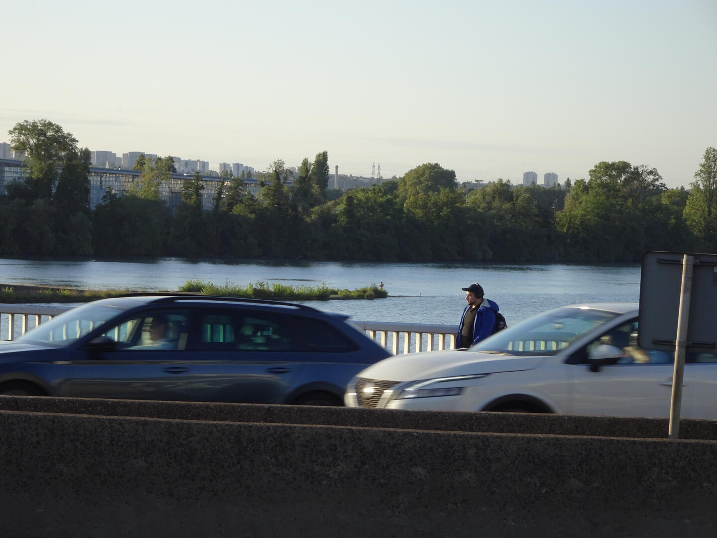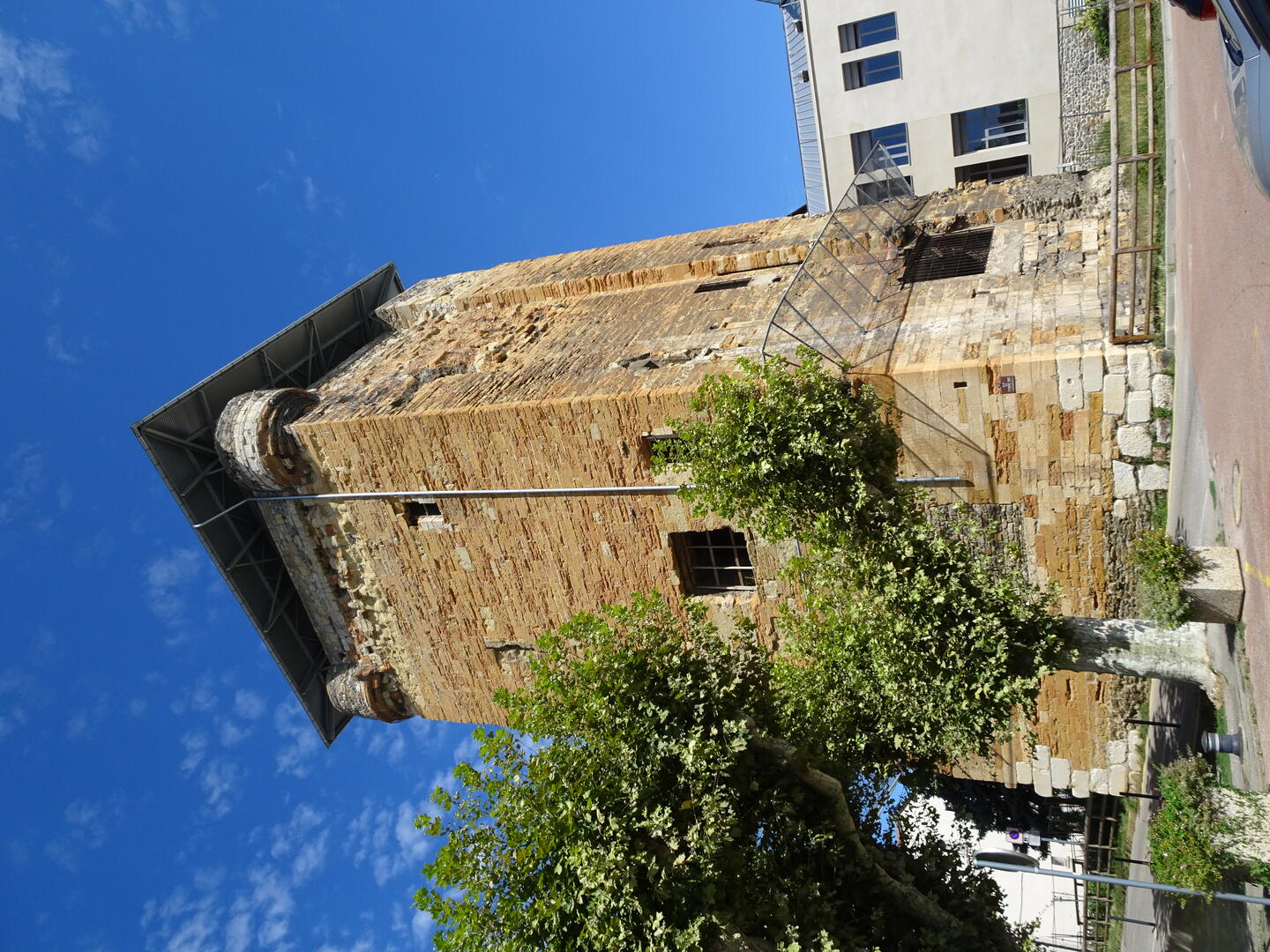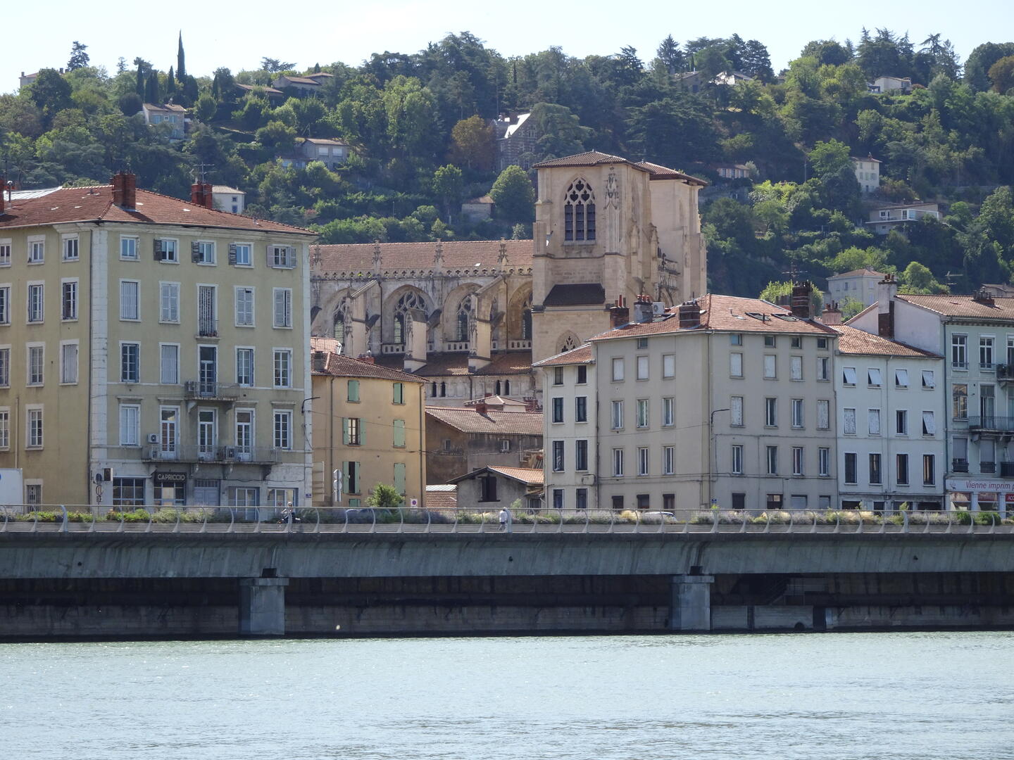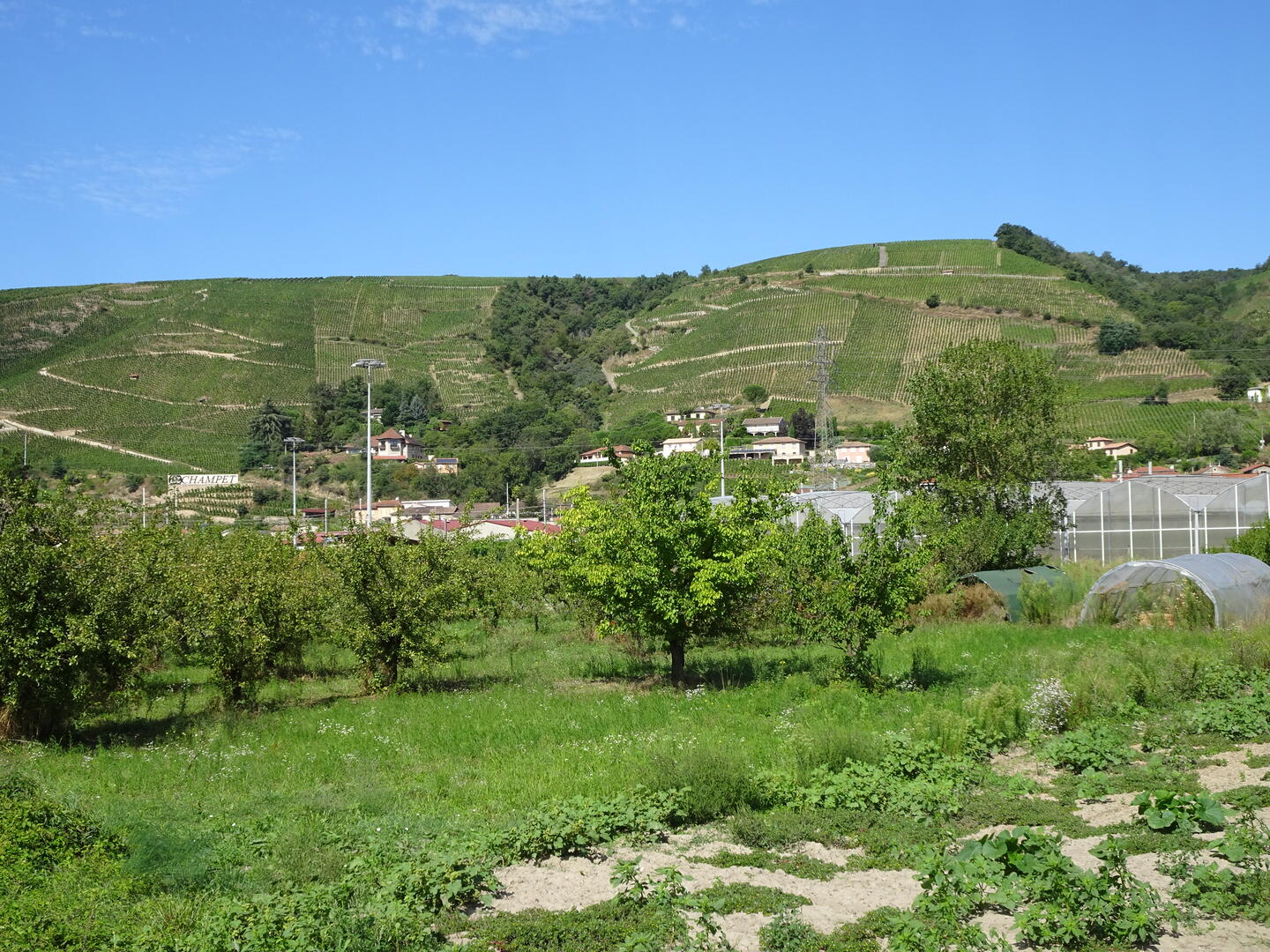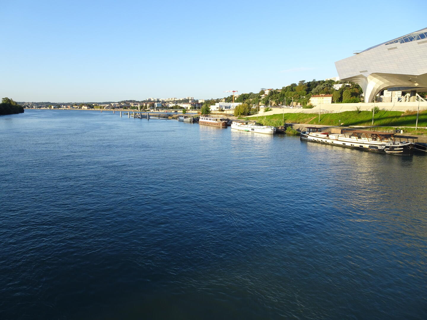 Nachdem wir das überraschend gute Frühstück in unserem Hotel, das bereits ab 6 Uhr angeboten wird, eingenommen hatten, konnten wir gegen 7:30 Uhr starten. Der morgendliche Berufsverkehr hielt sich in Grenzen. Die Führung etlicher Radweg-Umleitungen war unübersichtlich und unvollständig, sodass wir uns freuten, mit unserem Navigator die Orientierung zu behalten. Kurz nach unserem Aufbruch erreichten wir den Ort des Zuflusses der Saône in die Rhône. Auf der zwischen den Flüssen liegenden Landzunge befindet sich der futuristische Bau des Technikmuseums, Musée des Confluences. Nach etwa 15 km hatten wir das Stadtgebiet verlassen und freuten uns auf entspanntes Radeln am Fluss. Der als provisorisch angekündigte Teil des Radweges entpuppte sich jedoch als etwas, was bestenfalls als Mountainbike-Trail durchgehen würde. Für uns mit dem vielen Gepäck stellte er jedoch eine Herausforderung dar. Eine Möglichkeit, diesen Abschnitt zu umgehen, sahen wir nicht, denn parallel verläuft lediglich eine Autobahn. Nach etwa 5 km hatten wir es geschafft und konnten unsere Fahrt auf deutlich besserem Untergrund und meist auf Radwegen fortsetzen. Wir fuhren durch große Weinanbaugebiete, ausgedehnte Obstplantagen und Flächen, auf denen Gemüse angebaut wird.