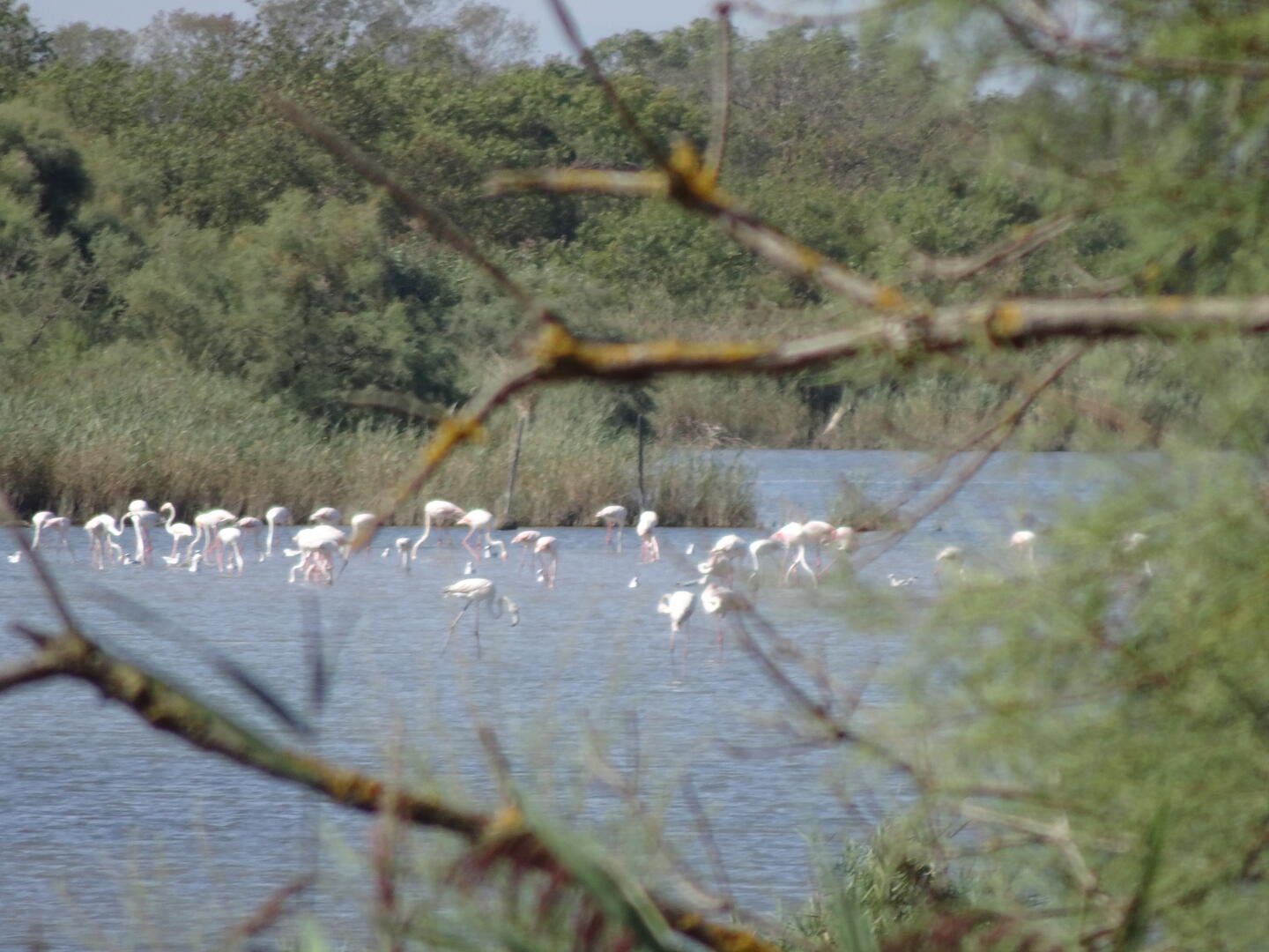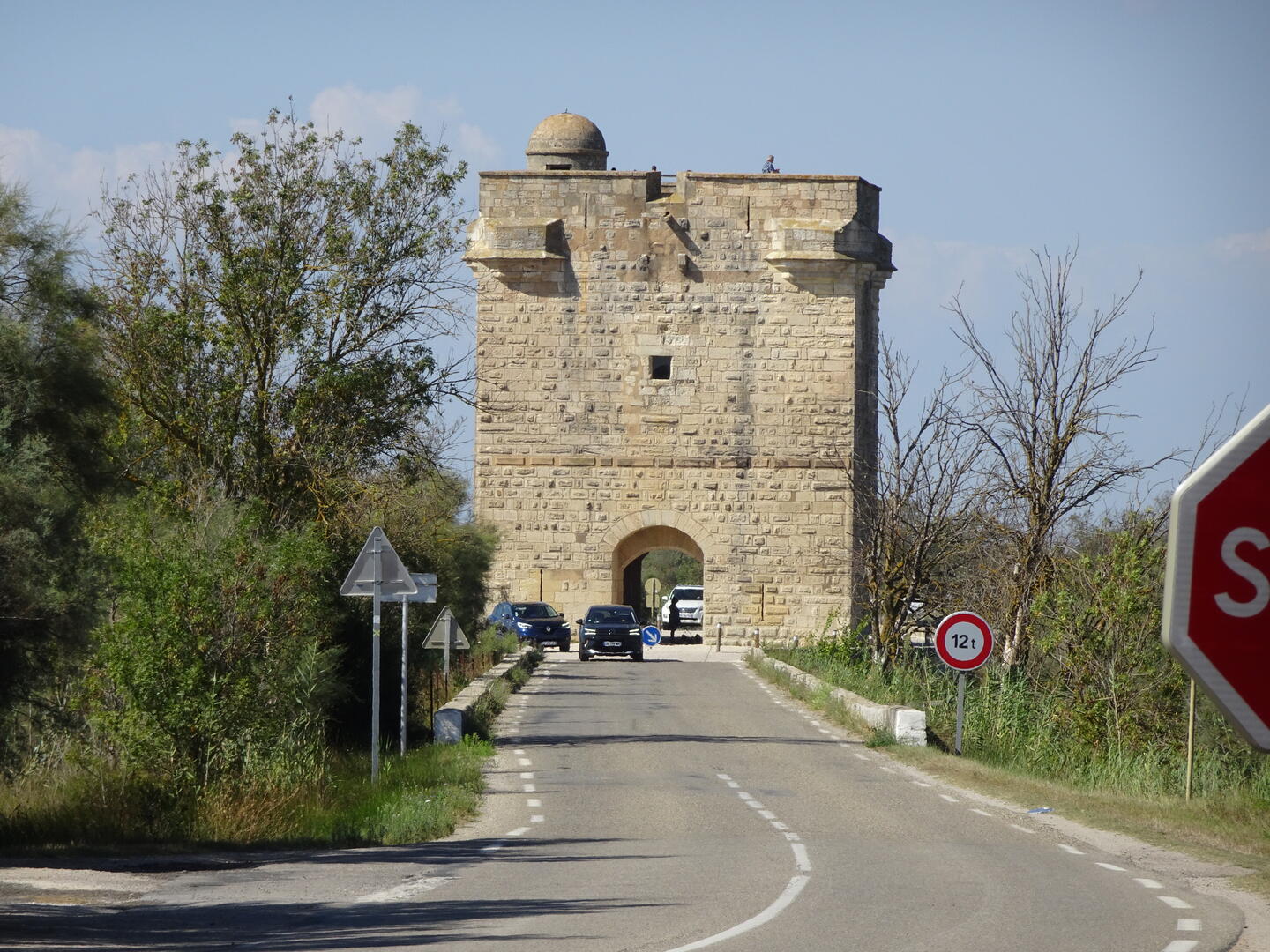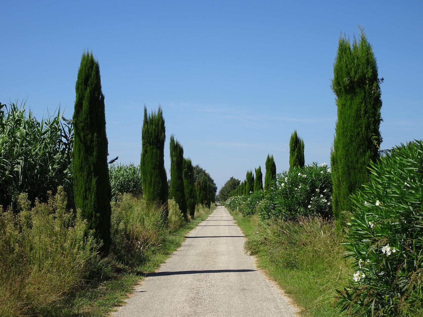 Die Straßen waren noch feucht, denn in der Nacht hatte es geregnet. Die Temperaturen waren angenehm und leichter Rückenwind ließ uns gut vorankommen. Zwischendurch wiesen Schilder auf den provisorischen Charakter des Radwegabschnitts hin. Das bedeutete, dass der Radweg nicht wie in der Endausbaustufe geteert ist, sondern einen feinen Schotterbelag hat. Der Weg führte uns heute durch eine fruchtbare Landschaft. Wir sahen große Obstplantagen, Wein- Gemüse- und die ersten Reisfelder. Am Canal du Rhône à Sète versorgten wir uns mit reifen, süßen Feigen direkt vom Baum und später probierten wir Äpfel von Bäumen einer Plantage. Wir sahen Störche, Flamingos, eine Wasserschildkröte und vermutlich Wasserratten. Zum Ende des Tages öffnete sich das Land zu einer weiten Ebene und wir durchfuhren bei spürbarem Gegenwind eine große Seenlandschaft.