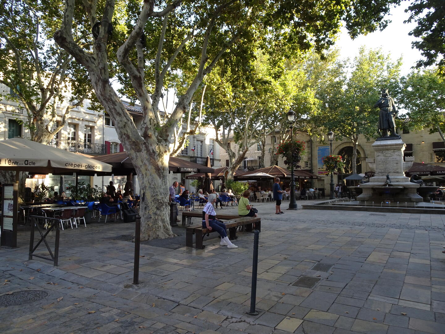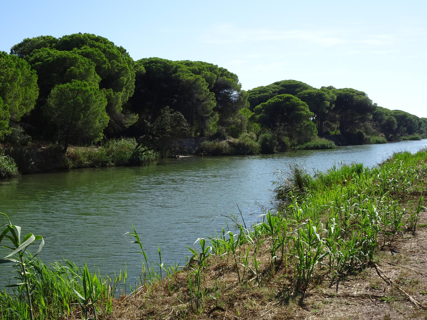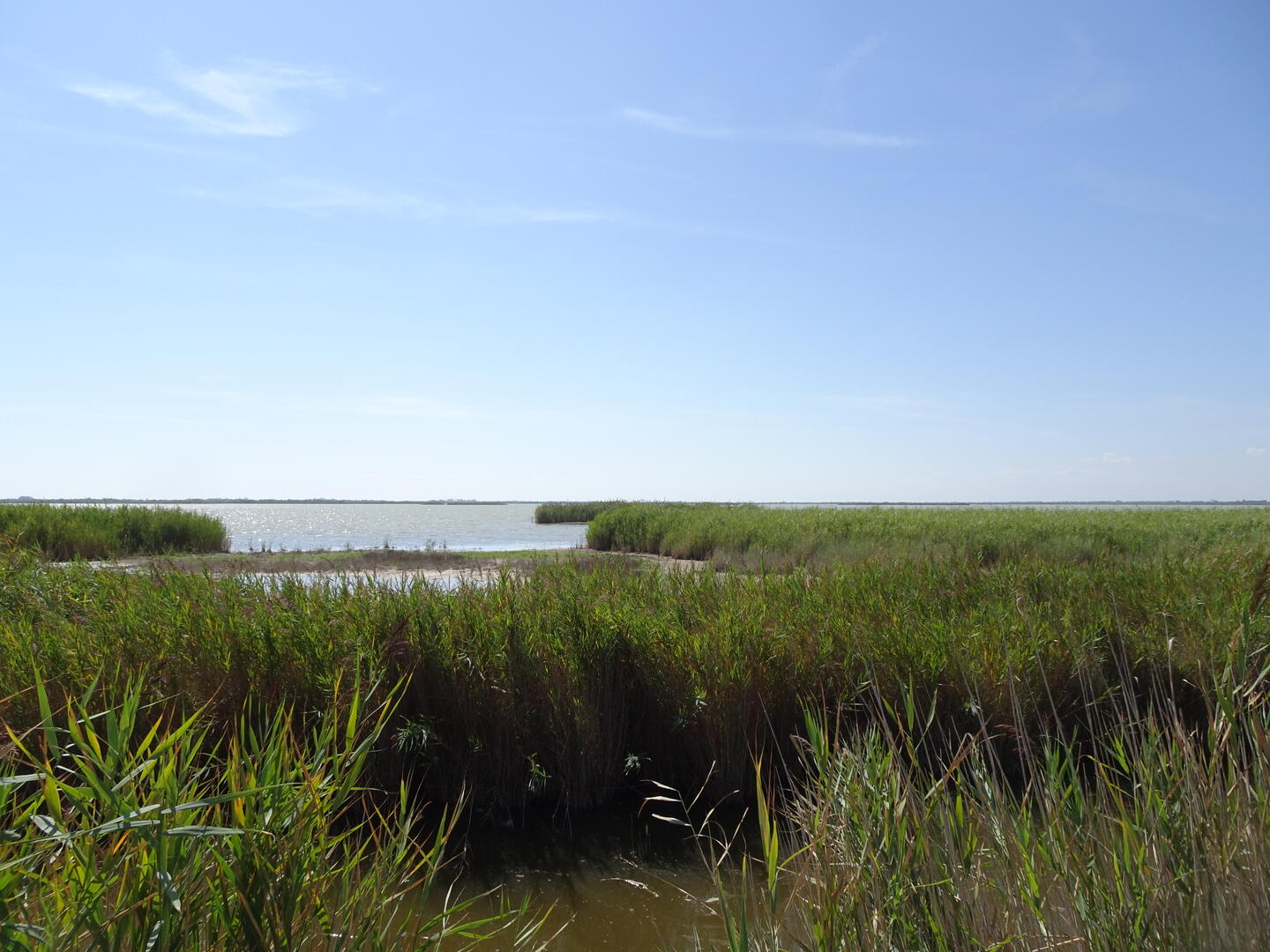 Die Straßen waren noch feucht, denn in der Nacht hatte es geregnet. Die Temperaturen waren angenehm und leichter Rückenwind ließ uns gut vorankommen. Zwischendurch wiesen Schilder auf den provisorischen Charakter des Radwegabschnitts hin. Das bedeutete, dass der Radweg nicht wie in der Endausbaustufe geteert ist, sondern einen feinen Schotterbelag hat. Der Weg führte uns heute durch eine fruchtbare Landschaft. Wir sahen große Obstplantagen, Wein- Gemüse- und die ersten Reisfelder. Am Canal du Rhône à Sète versorgten wir uns mit reifen, süßen Feigen direkt vom Baum und später probierten wir Äpfel von Bäumen einer Plantage. Wir sahen Störche, Flamingos, eine Wasserschildkröte und vermutlich Wasserratten. Zum Ende des Tages öffnete sich das Land zu einer weiten Ebene und wir durchfuhren bei spürbarem Gegenwind eine große Seenlandschaft.