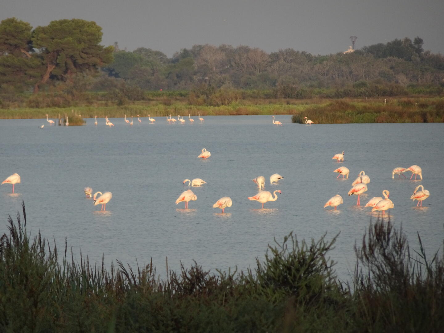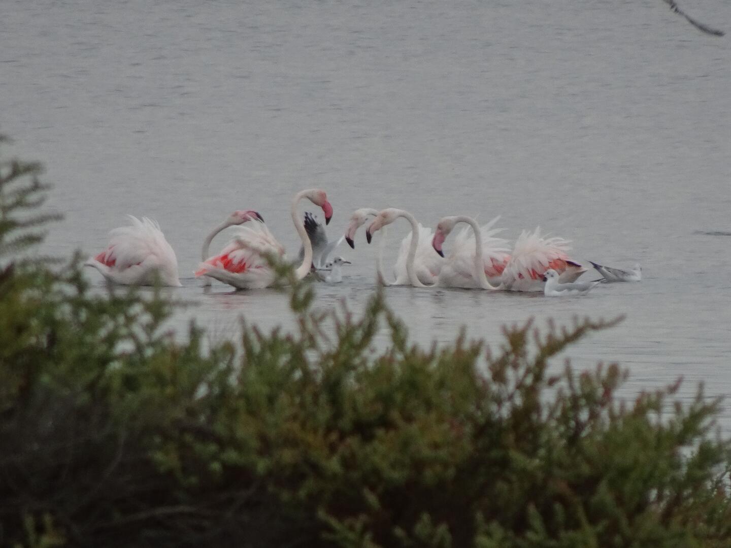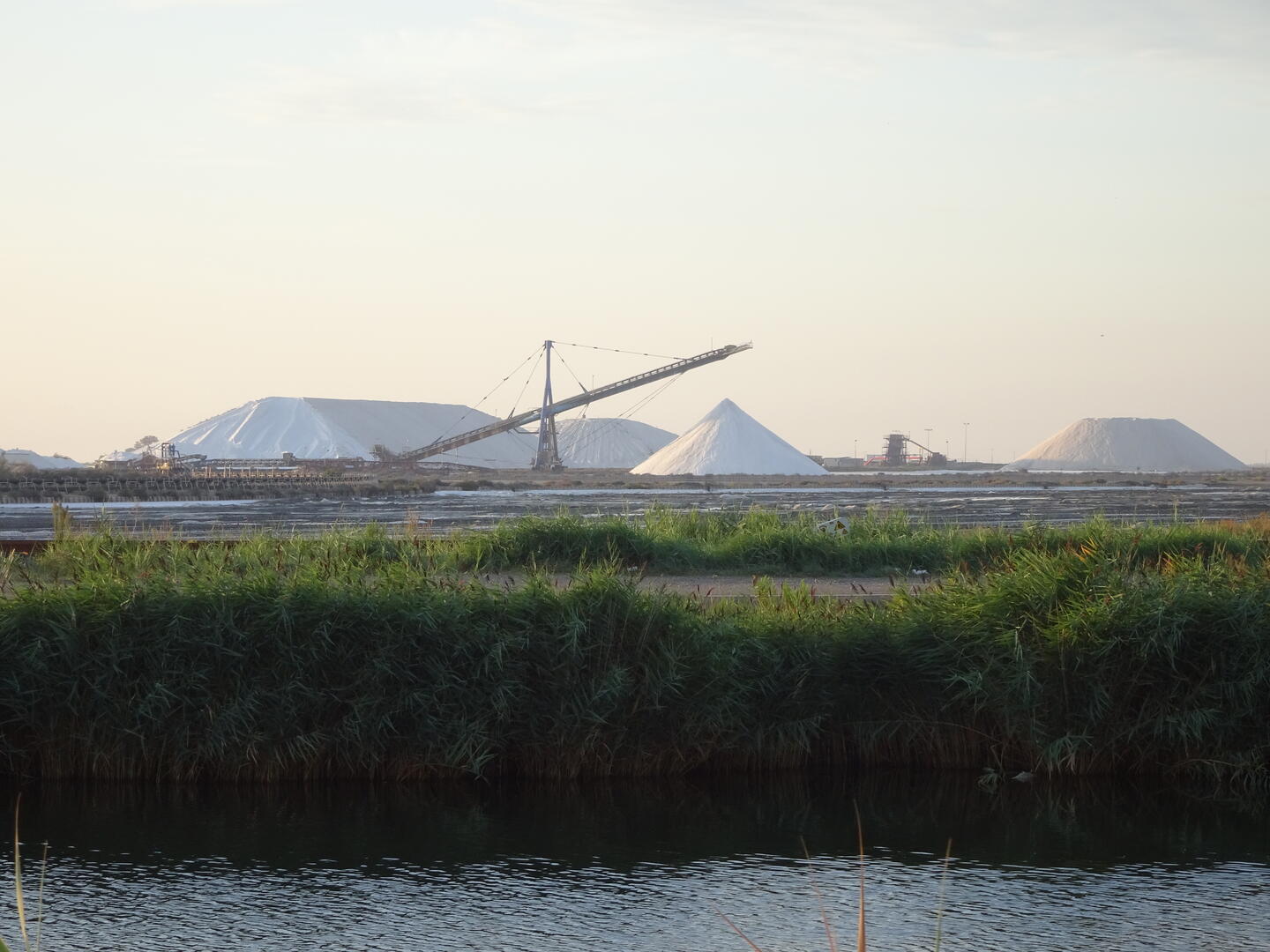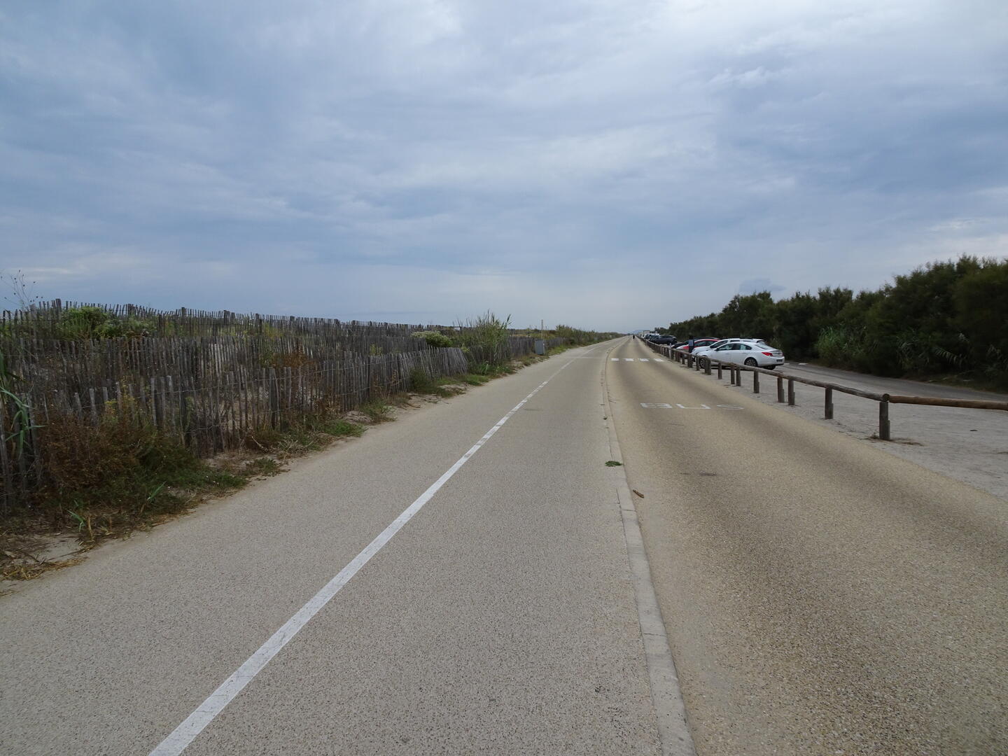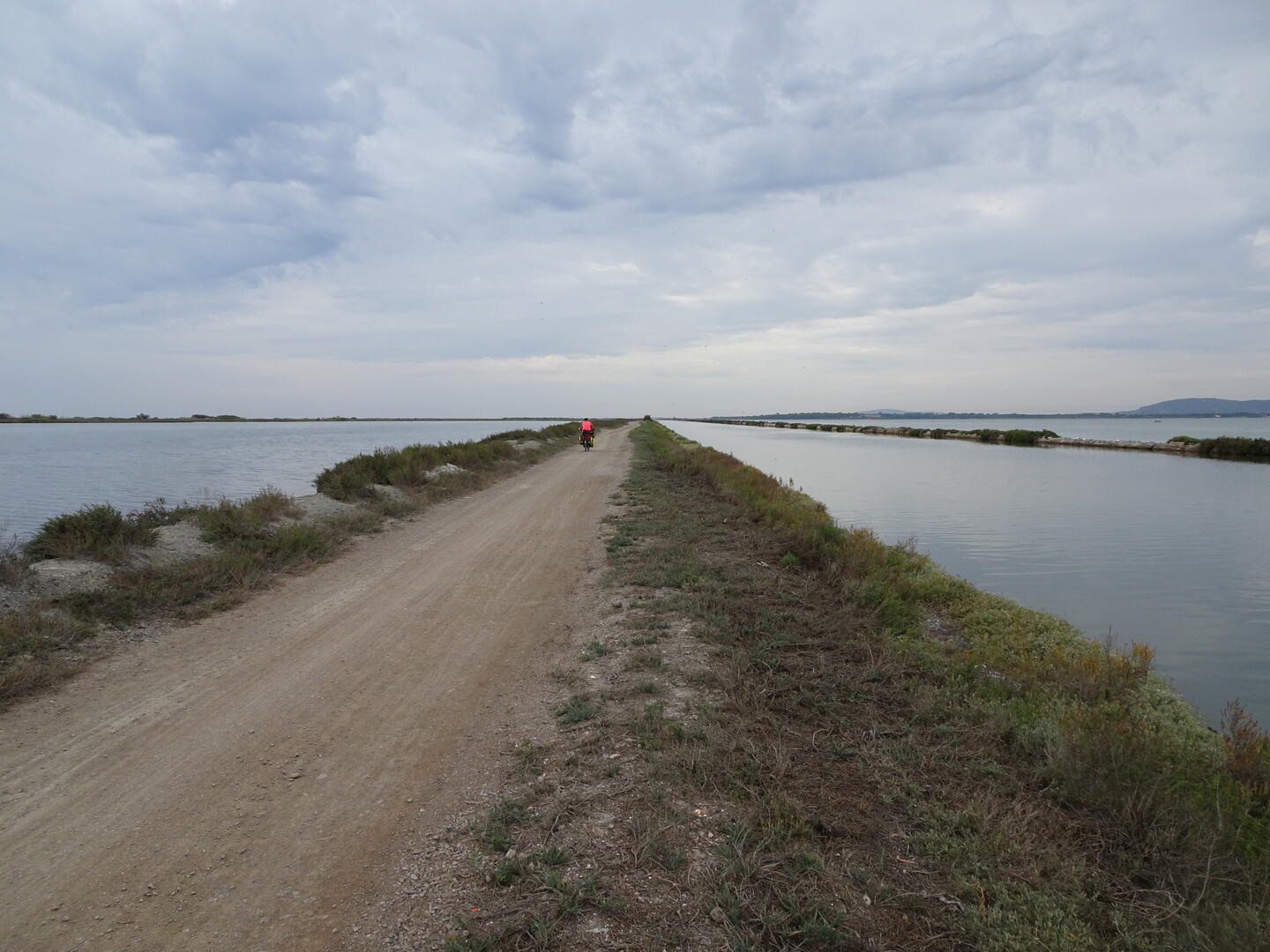Die aufgehende Sonne ließ die Flamingos, die wir heute in großer Zahl und an vielen Stellen sahen, in einem warmen Weiß erscheinen, das sich im Wasser spiegelte. Zwischen Kilometer 7 und 17 wurden wir und unsere Räder durch die extrem schlechte Wegstrecke in Le Grau-du-Roi und La Grande-Motte gemartert. Zahllose durch Baumwurzeln hervorgerufene Beulen im Asphalt und in Fahrtrichtung verlaufende breite Fugen zwischen in ihrer Höhe nur selten fluchtenden Radwegplatten lassen uns vermuten, man schämt sich – zu Recht – des Radwegs und verzichtet deswegen weitgehend auf seine Beschilderung.