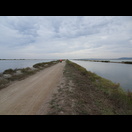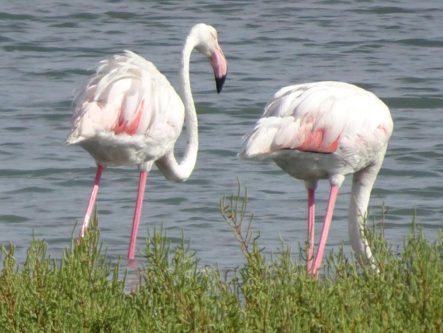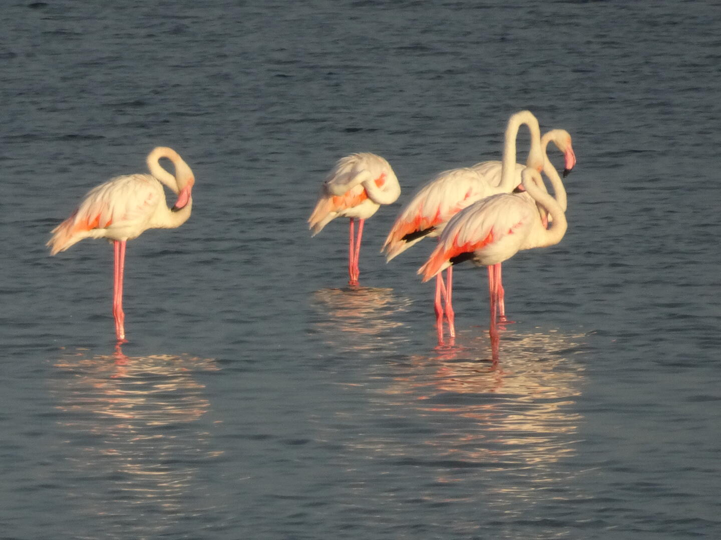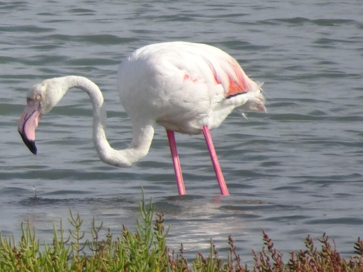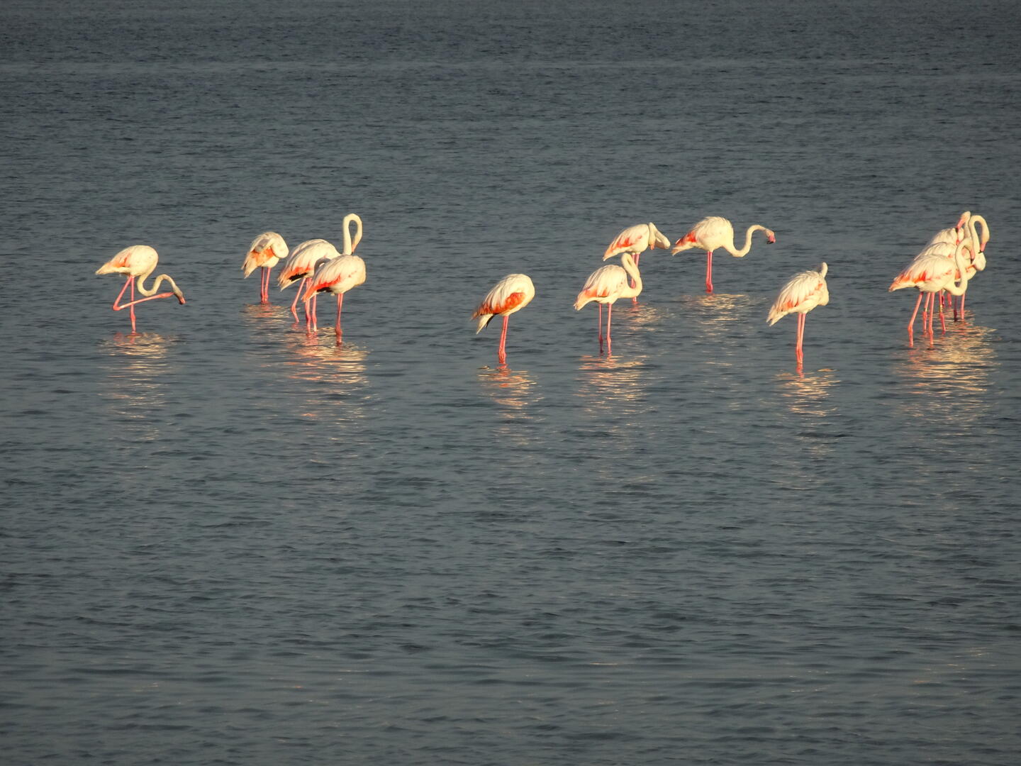 Die aufgehende Sonne ließ die Flamingos, die wir heute in großer Zahl und an vielen Stellen sahen, in einem warmen Weiß erscheinen, das sich im Wasser spiegelte. Zwischen Kilometer 7 und 17 wurden wir und unsere Räder durch die extrem schlechte Wegstrecke in Le Grau-du-Roi und La Grande-Motte gemartert. Zahllose durch Baumwurzeln hervorgerufene Beulen im Asphalt und in Fahrtrichtung verlaufende breite Fugen zwischen in ihrer Höhe nur selten fluchtenden Radwegplatten lassen uns vermuten, man schämt sich – zu Recht – des Radwegs und verzichtet deswegen weitgehend auf seine Beschilderung.