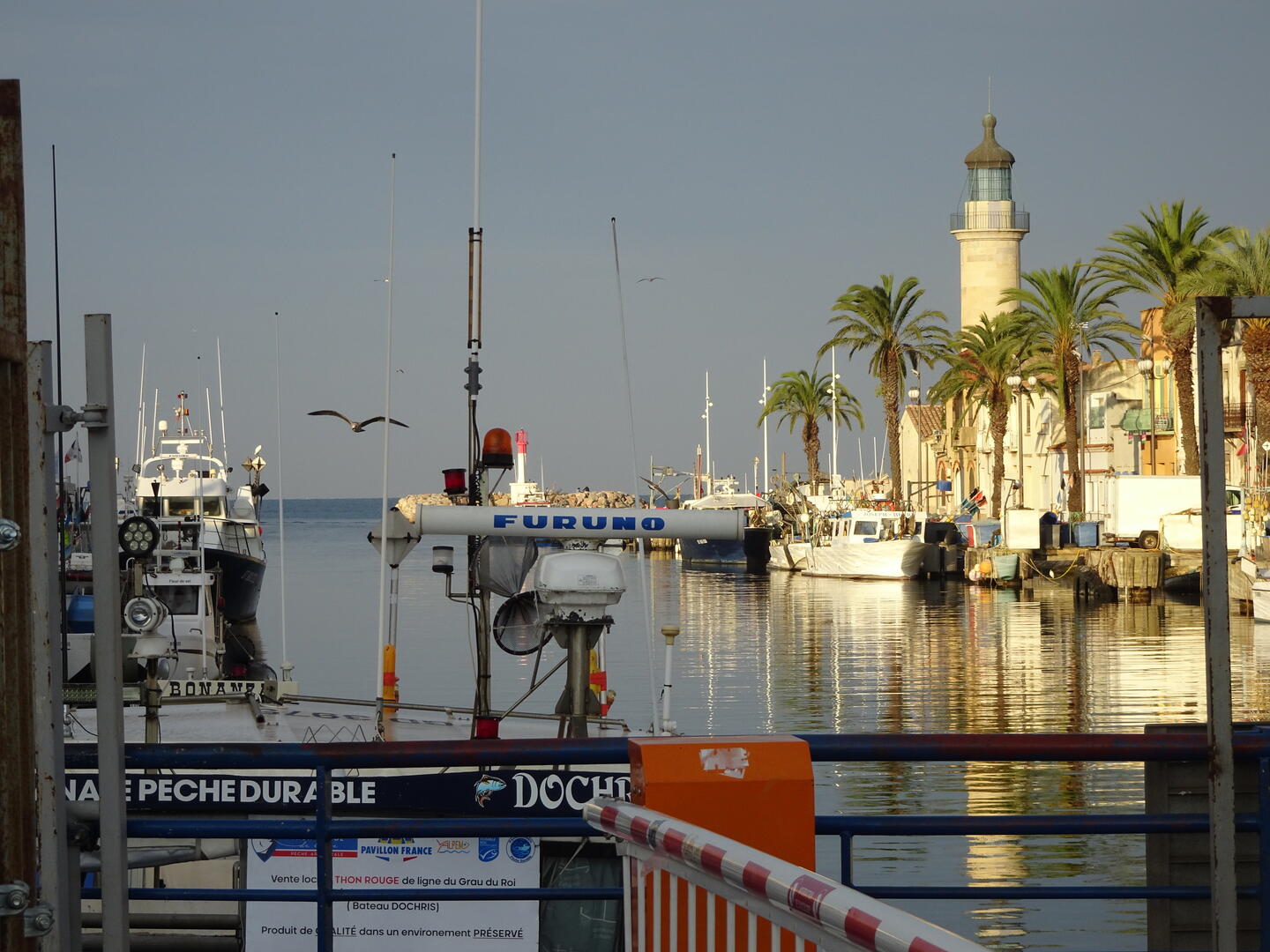 Outlet vom Canal du Rhône à Sète und der Leuchtturm in Le Grau-du-Roi Wo?Nach Rechtsklick