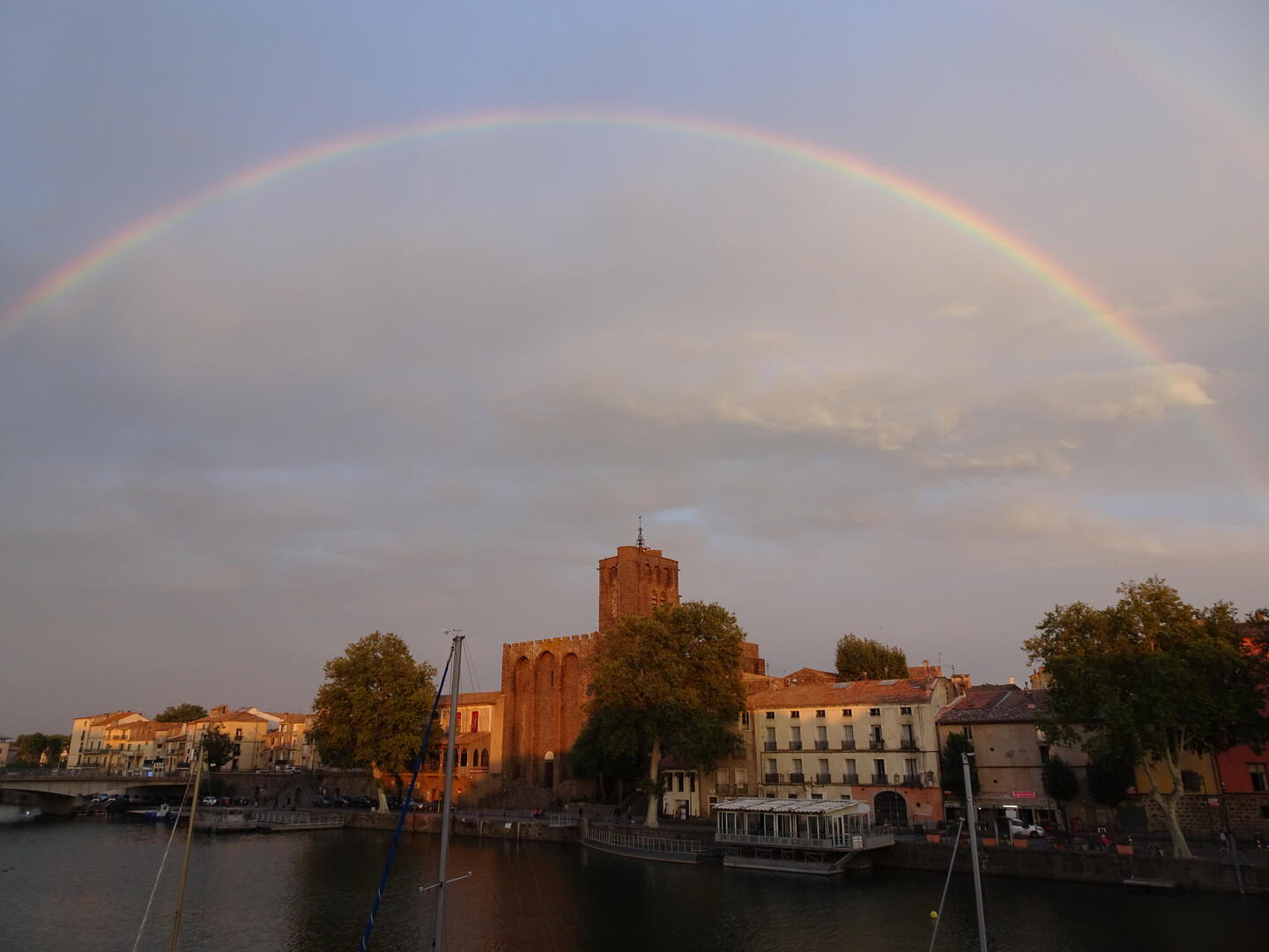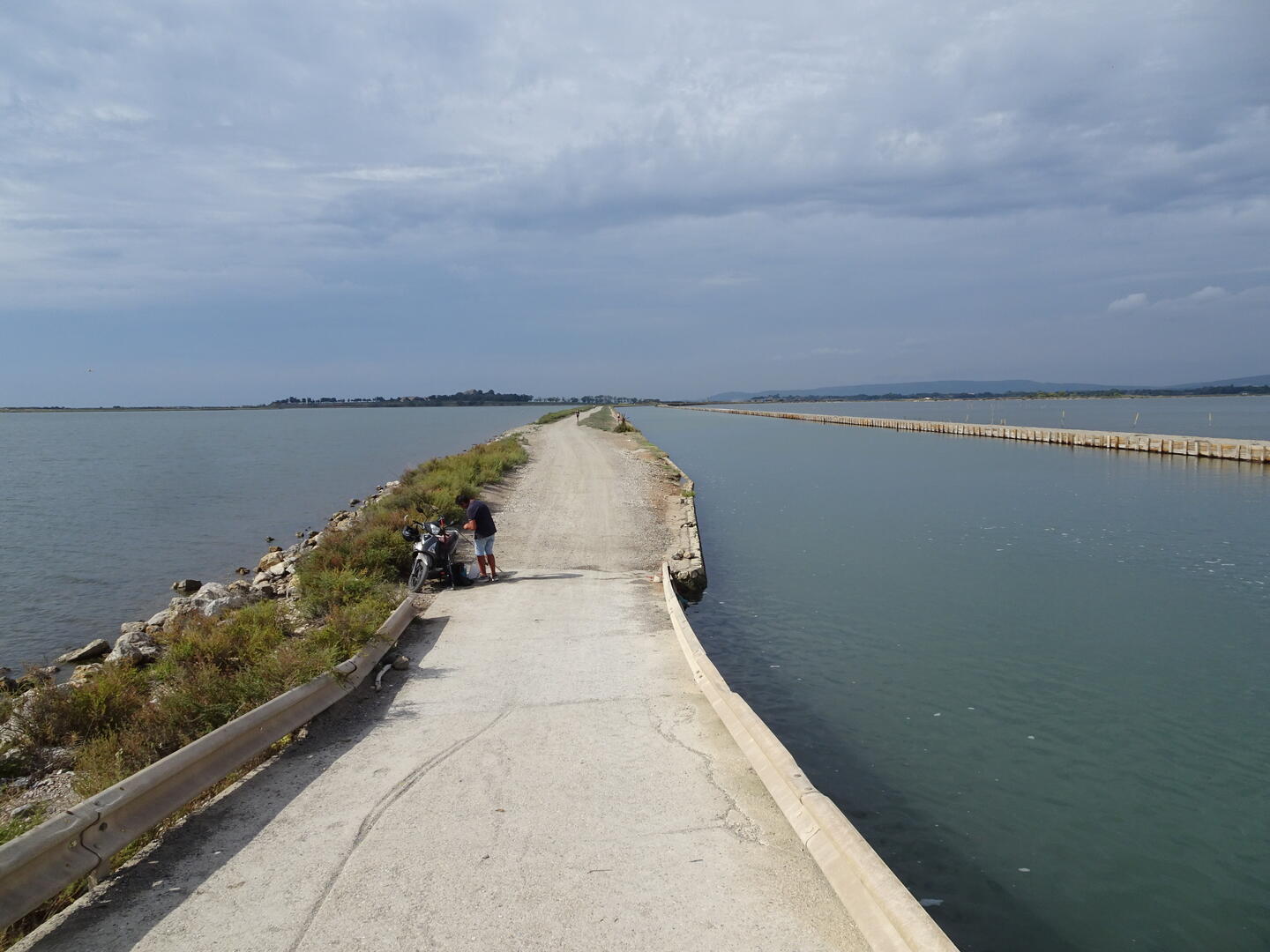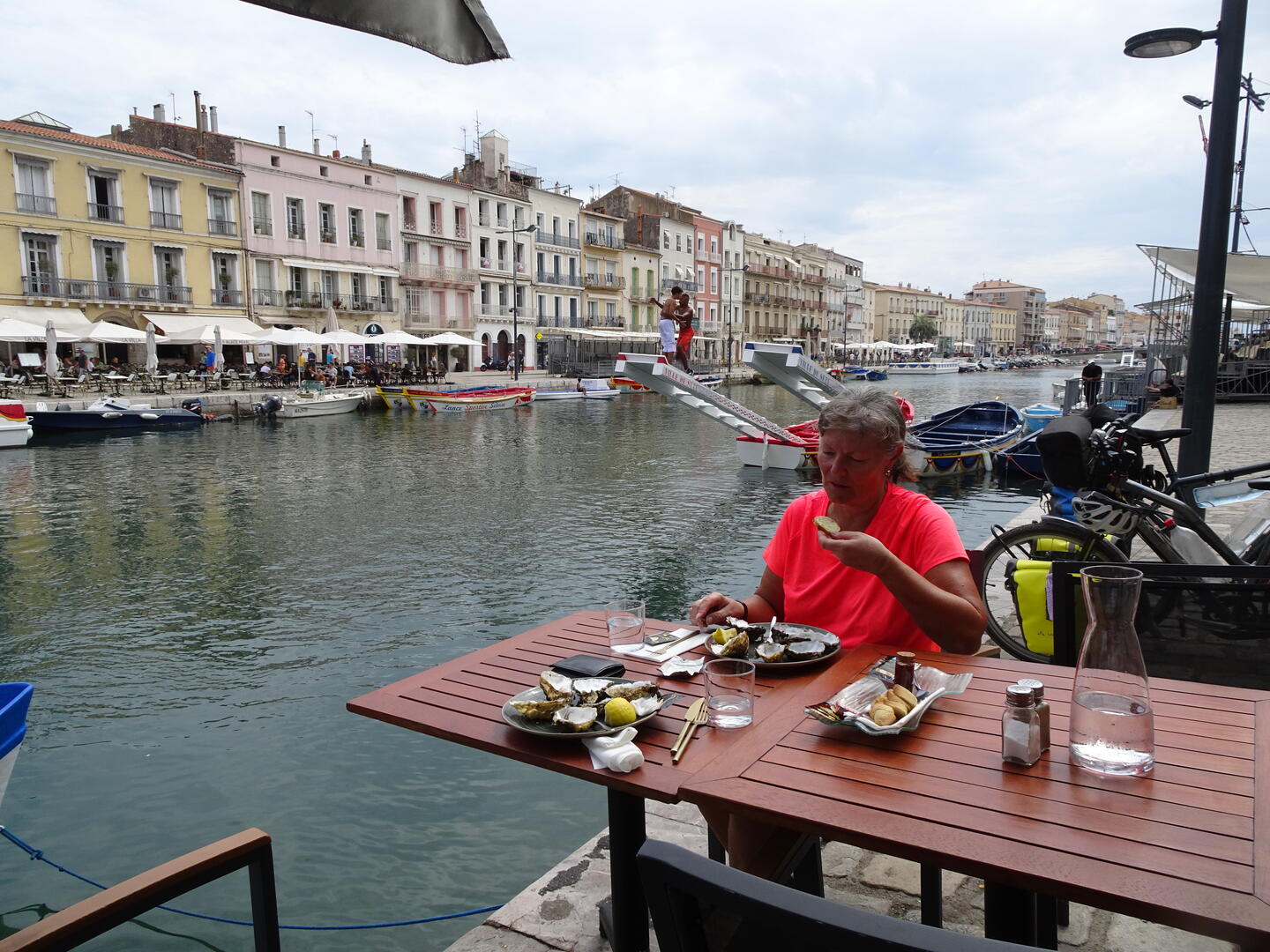 Unser weiterer Weg nach Sète führte über Schotter entlang des Canal du Rhône à Sète. Entschädigt wurden wir mit wunderbaren Ausblicken auf scheinbar endlose Wasserlandschaften mit ihren Bewohnern: Flamingos, Kormorane, Reiher und Möwen. In Sète aßen wir am Canal Royal wie während unserem letzten Besuch sehr schmackhafte Austern. Auf Wein verzichteten wir, er hätte das Fahren erschwert. Wir fuhren noch weitere knapp 25 km bis Agde. Auch hier empfingen uns ein schlechter Radweg, viele Kreisverkehre und fehlende oder irreführende Radwegweiser. Dank des Navigators fanden wir dennoch unser Hotel und genießen jetzt den Blick auf den Fluss Hérault und die auf dem gegenüberliegenden Ufer befindliche festungsähnliche ehemalige Kathedrale von Agde.