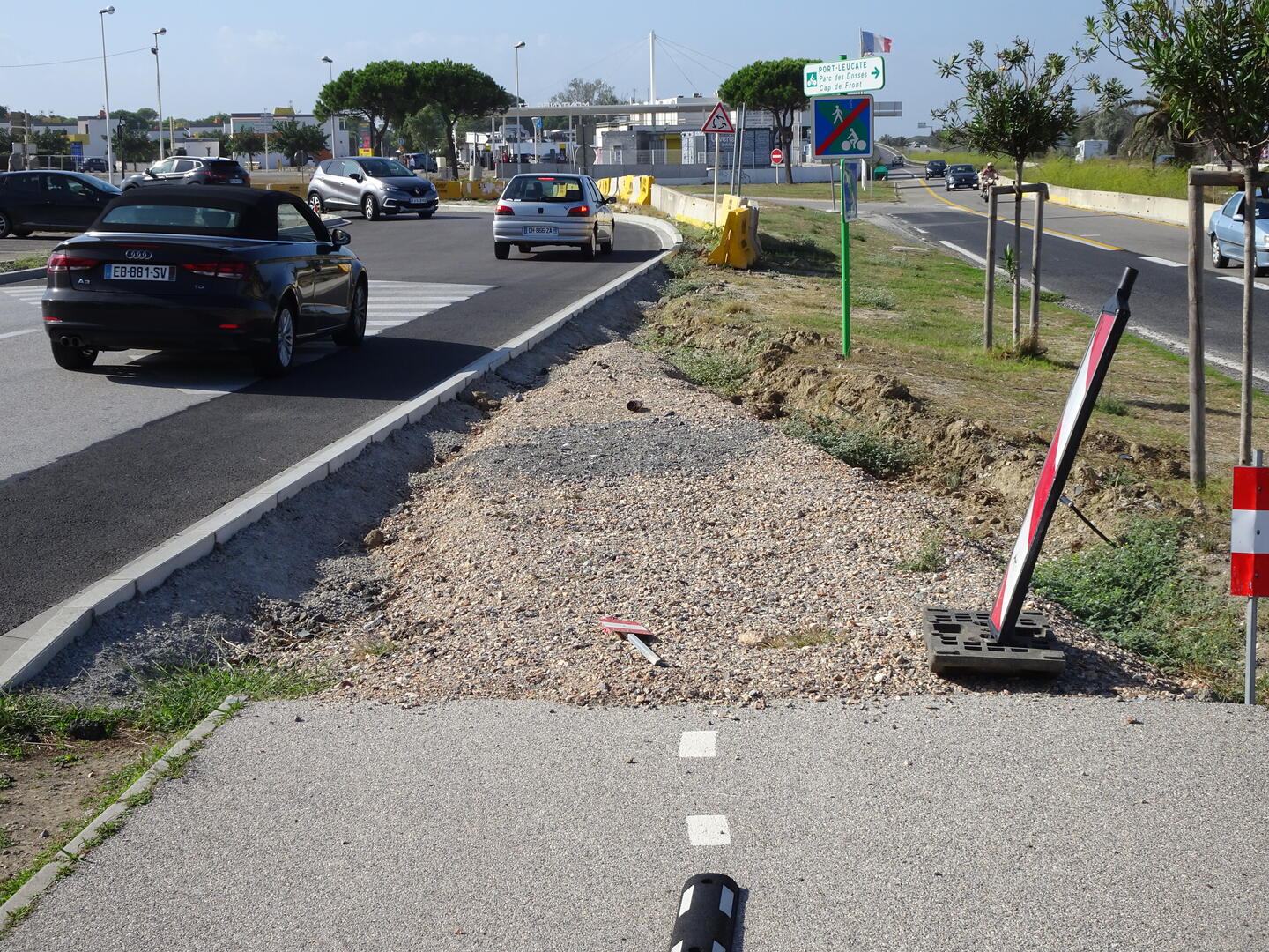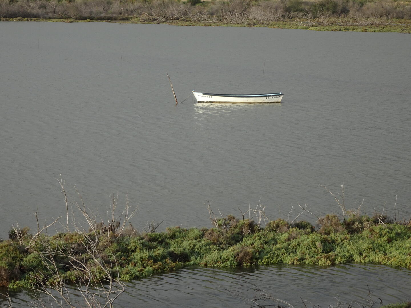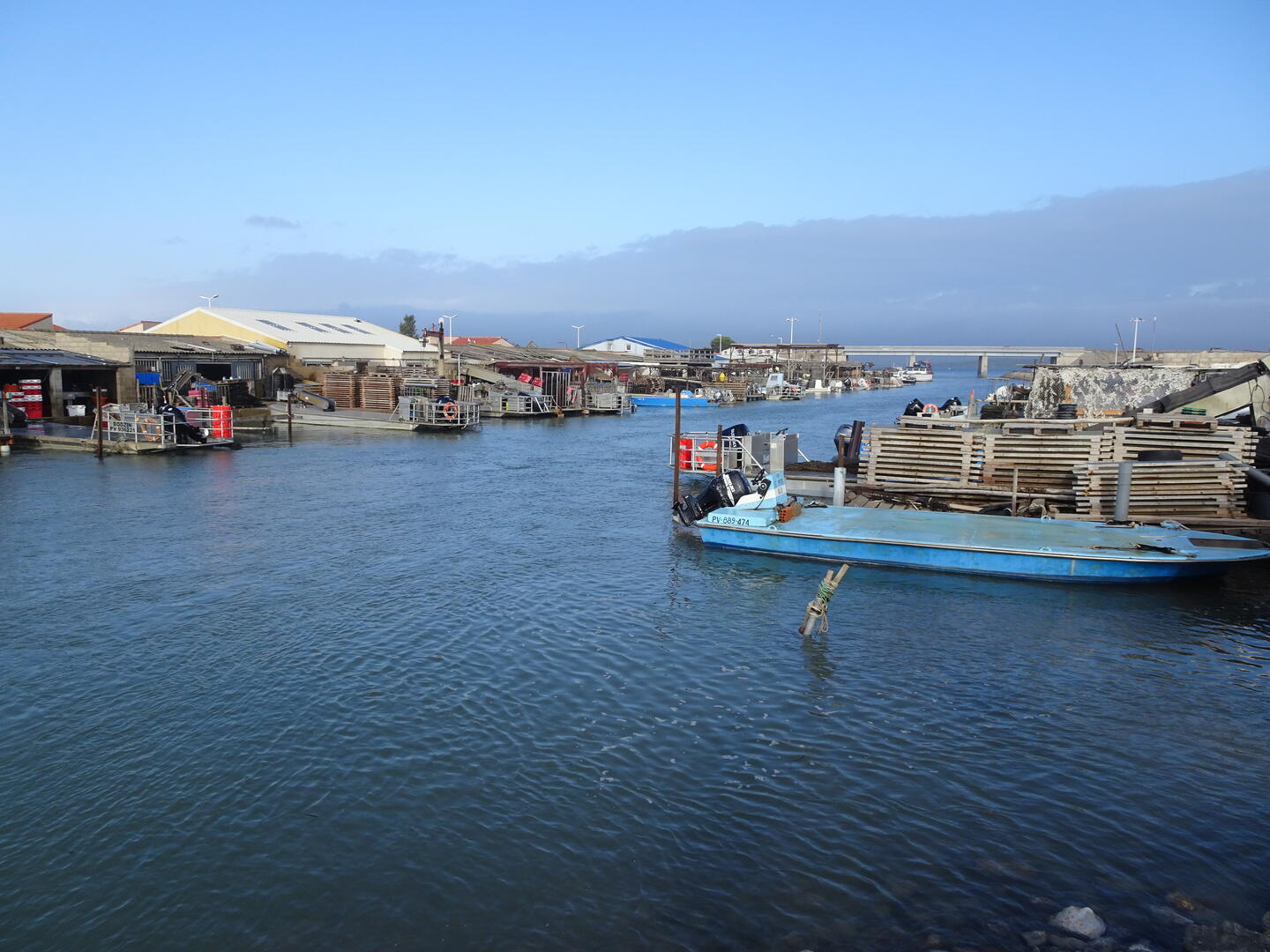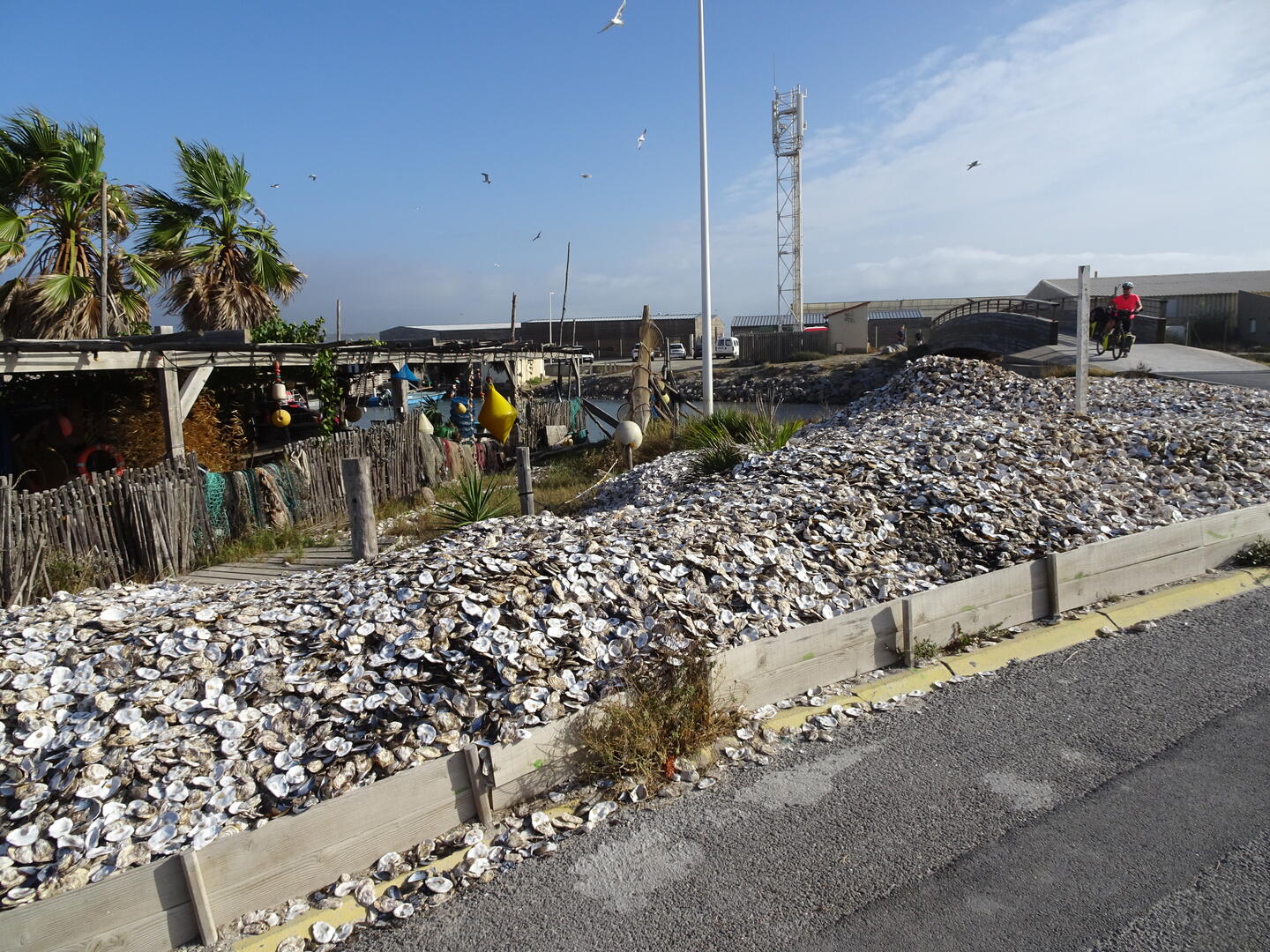 Zunächst fuhren wir ohne Sonnenbrillen, da dichte Wolken die Sonne verdeckten. Später legte sich schnell Salz auf unsere Brillen. Der Wind behinderte uns heute weniger als befürchtet. Er blies zur Freude der Kitesurfer kräftig, doch selten als direkter Gegenwind. Bereits gegen 9:30 Uhr erreichten wir den uns von unserer ersten Reise bekannten Durchfluss des Étang de Leucate zum Mittelmeer, wo mehrere kleine Lokale vorwiegend Austern anbieten, die dort angelandet werden. Zu unserem Glück hatte eines bereits geöffnet. Selbstverständlich nutzten wir wieder die Gelegenheit und wurden nicht enttäuscht. Wir fuhren heute eine längere Strecke direkt am Meer entlang großer Salinen.