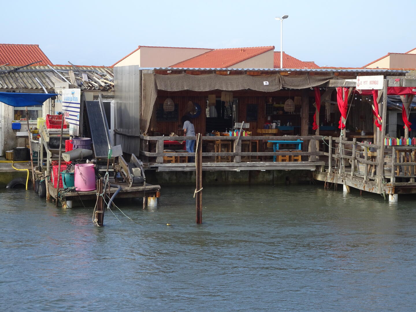 Eines der typischen Austernlokale am Durchfluss des Étang de Leucate zum Mittelmeer Wo?Nach Rechtsklick