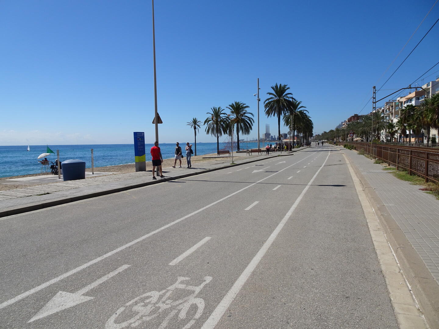 Als wir 2015 das erste Mal Barcelona durchfuhren, bewegten wir uns auf den rechtwinklig zueinander verlaufenden Straßen des im Schachbrettmuster angelegten Straßennetzes. Wir erinnern uns noch an die unzähligen Ampelstopps, die uns an eine Rote-Welle für Radfahrer glauben ließen. Dagmar sah sich damals an ihre Grenzen gekommen und wechselte ständig die Seite, zu der sie vor den roten Ampeln abstieg. Diesmal hatte das Navigationsprogramm den Weg über die Avinguda Diagonal vorgesehen, die geradlinig das Schachbrettmuster diagonal durchschneidet. Obwohl sie eine der bedeutendsten Straßen Barcelonas ist, ließ sich auf ihr unerwartet gut Rad fahren, oft auf Radwegen des breiten, mit Bäumen bestandenen Grünstreifens zwischen den Richtungsfahrbahnen für den Autoverkehr. Barcelona haben wir diesmal als fahrradfreundliche Stadt kennengelernt, wobei die Beschilderung für Ortsunkundige noch optimiert werden könnte.