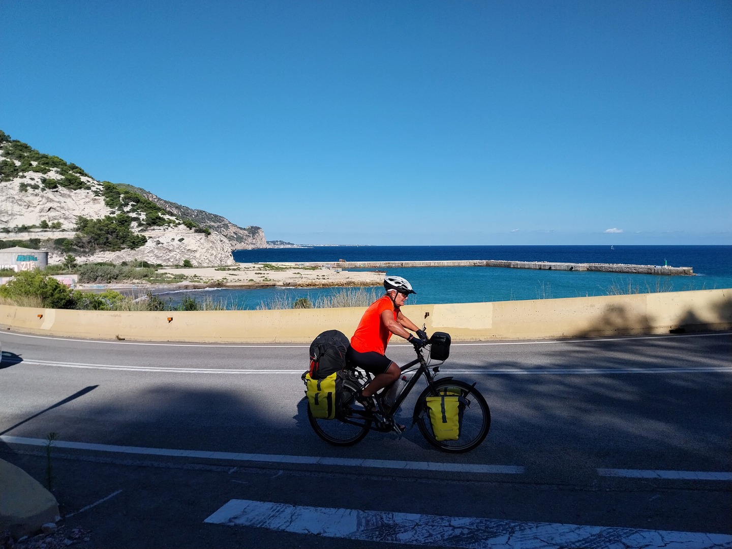 Das erst ab 8 Uhr angebotene Frühstück haben wir heute nicht mehr wahrnehmen können, denn um die Zeit saßen wir bereits auf unseren Rädern. Die Route führte uns zunächst in Strandnähe teils über schlechte Sandwege und die oft verspringende und vorwiegend von Fußgängern mit ihren Hunden genutzte Strandpromenade. Nach einer Baustelle und der entsprechenden Umleitung wechselten wir bald auf die uns bereits bekannte Nationalstraße N-II mit dem meist ausreichend breiten Seitenstreifen, auf dem wir unbehelligt fahren konnten. Gegen 11 Uhr wies das Zischen an Diez‘ Hinterrad laut auf einen kapitalen Platten hin. Ein langes, ungewohnt dickes Drahtstück hatte sich durch Decke und Schlauch gebohrt. Der Vorteil eines so großen Lochs ist, dass es sich im Schlauch leicht lokalisieren lässt. Zwar musste das Hinterrad dennoch ausgebaut werden, eine zeitraubende Lecksuche erübrigte sich jedoch, sodass es vom Anhalten bis zum Wiederlosfahren nur gut eine halbe Stunde dauerte.