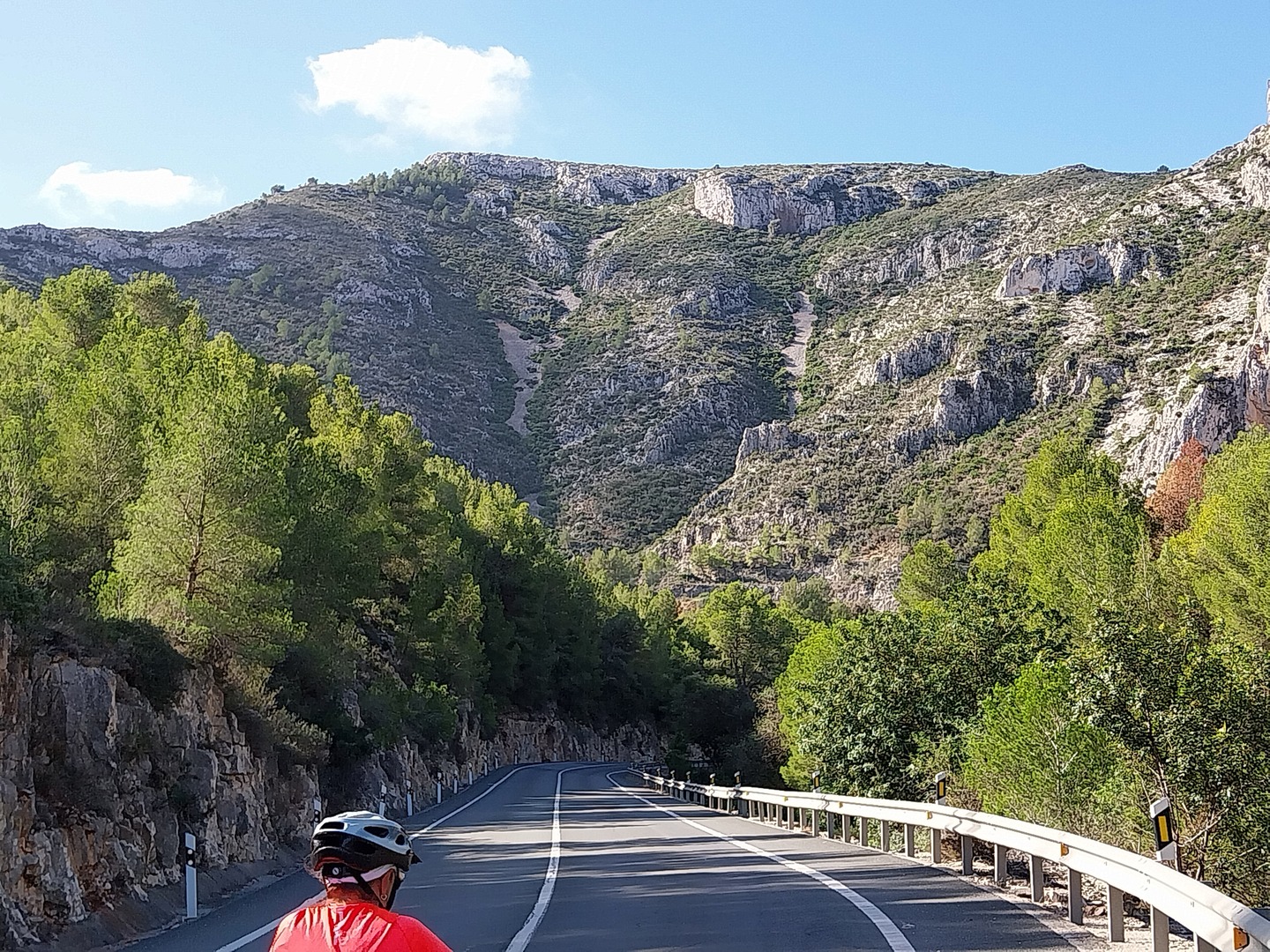 Der heutige Start verlief genauso bequem wie unsere gestrige Ankunft. Auf dem Flur vor unserem Zimmer konnten wir die Räder packen und der Aufzug brachte uns in die Lobby. Dadurch waren wir recht früh und konnten noch vor Sonnenaufgang losfahren. Der morgendliche Berufsverkehr war lebhafter als erwartet. Da es zu Beginn keine großen Steigungen gab, kamen wir auf der gut ausgebauten N 332 gut voran. Wie während der vorangegangenen Etappe ging es zunächst durch große Orangenplantgen. Nach etwa 40 km begann schließlich der Anstieg. Für etwa 10 km fuhren wir moderat bergauf. Die Straße führte uns durch eine wilde Felslandschaft und vorbei an einem großen Steinbruch. Nach der etwa 6 km langen Abfahrt, während der uns der auffrischende Gegenwind etwas bremste, sahen wir bereits die Hochhäuser von Benidorm.