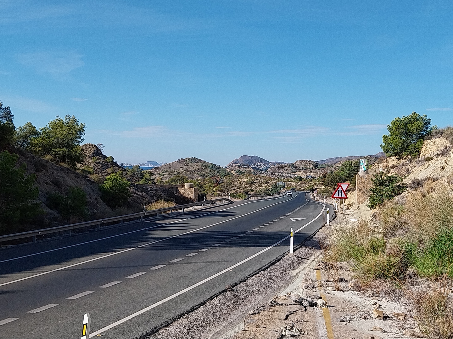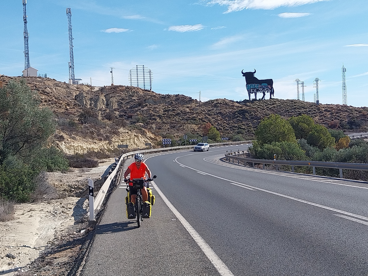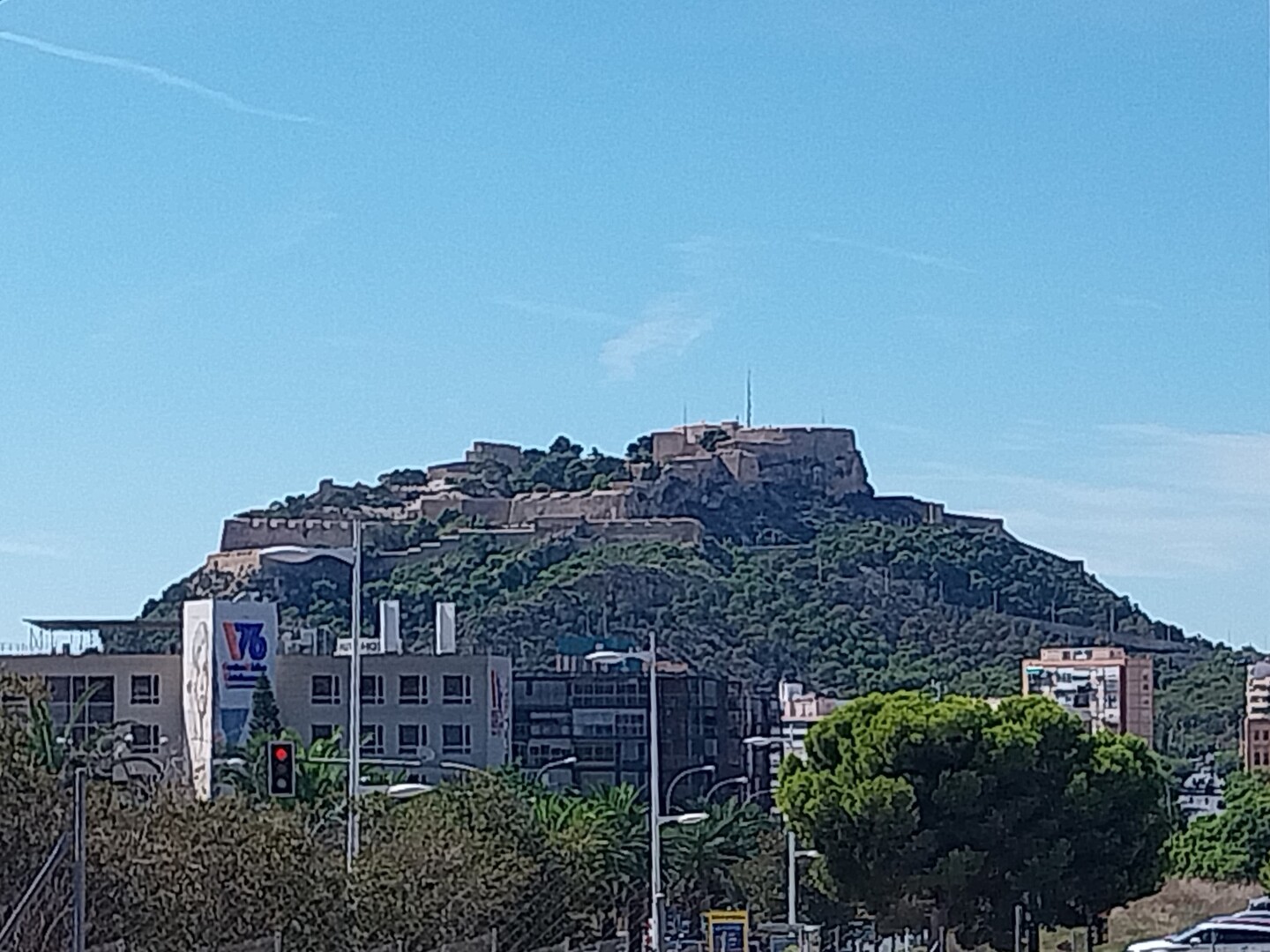Nach einem unerwartet guten Frühstück in unserem Hotel starteten wir erst gegen 9:30 Uhr. Es war bereits sehr warm und der Himmel zeigte nur einigen Schleierwolken. Der Weg aus Benidorm war unkompliziert und hatte weniger Steigungen als wir erwartet hatten. In diesem Teil Spaniens ist die Küstenregion sehr hügelig und selbst auf kürzeren Etappen müssen etliche Höhenmeter bewältigt werden. So gab es auch heute einige unangenehm steile Steigungen und gegen Mittag frischte zudem der Gegenwind merklich auf. Da wir in der Nähe des Meeres fahren, entschädigen uns die schönen Ausblicke auf karibisch anmutende Strände mit blaugrünem Wasser für die Anstiege. Wir hatten hier in Alicante einen Ruhetag vorgesehen und suchten wegen der besseren Infrastruktur ein Hotel in der Altstadt. Die erste angefahrene Unterkunft war ein Hostel ohne Rezeption und wir hatten keine Hoffnung, dort unsere Räder unterstellen zu können. Die nächste Unterkunft hatte zwar noch ein Zimmer, doch der Manager sah keine Möglichkeit, unsere Fahrräder unterzubringen. Das Dritte hatte zwar keine Schwierigkeit mit unseren Rädern, hätte uns jedoch nur für eine Nacht aufnehmen können. Erst das im Anschluss aufgesuchte Apartment erfüllt alle Kriterien und das sogar zu einem relativ niedrigen Preis. Die Fahrräder stehen jetzt auf der zum Apartment gehörigen Terrasse.