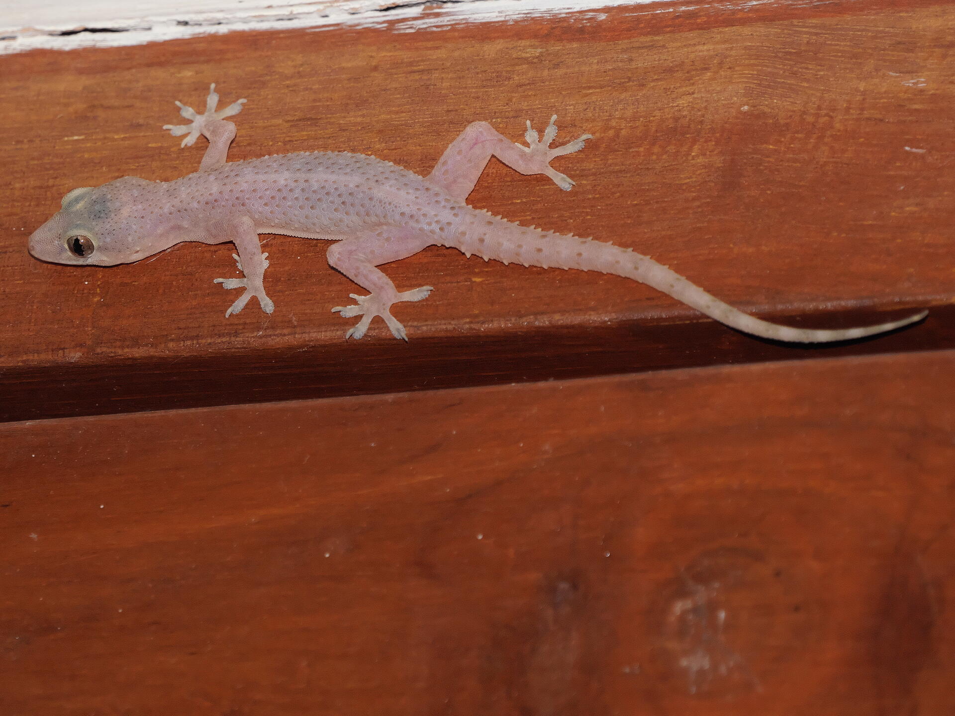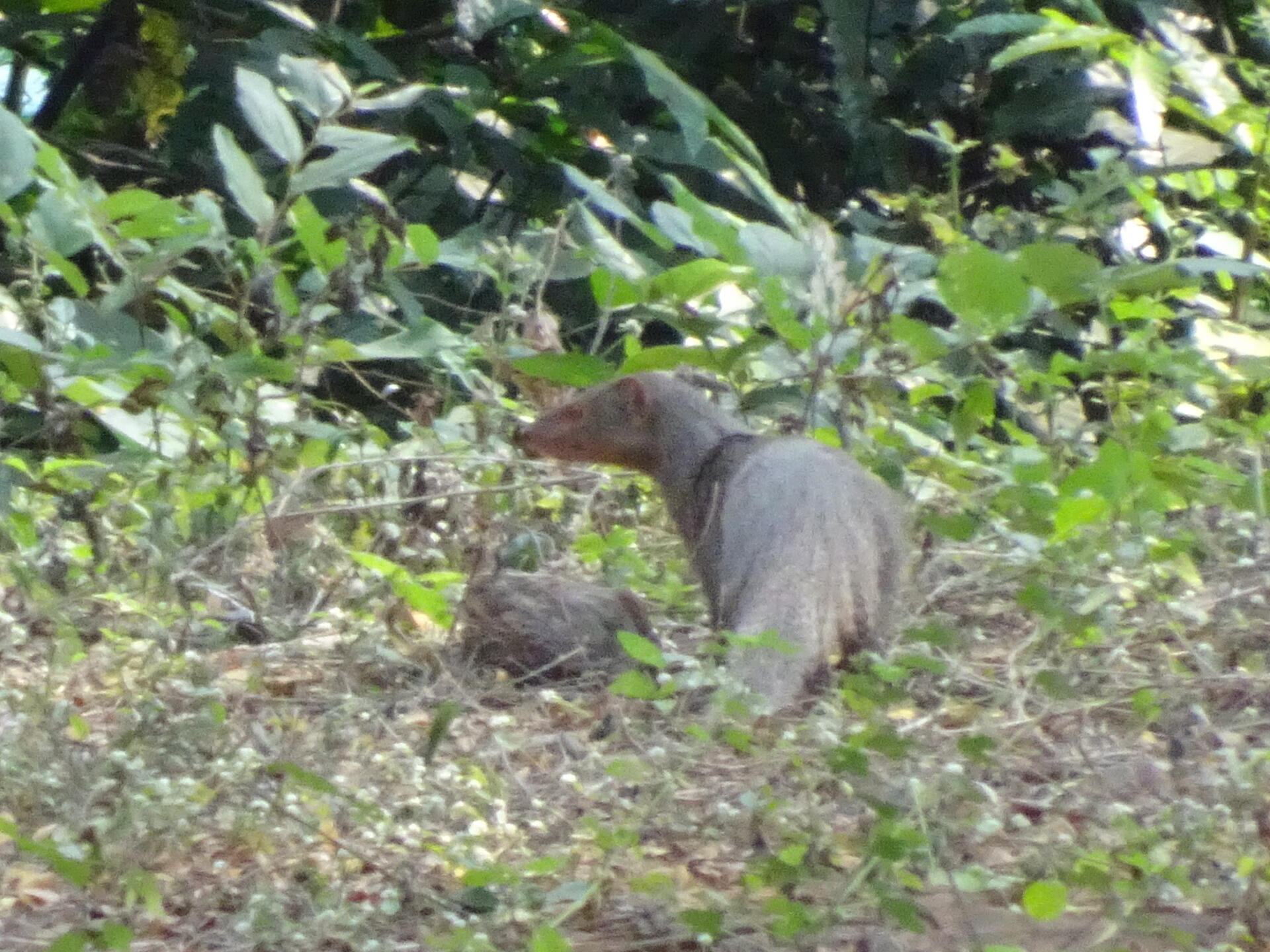 Heute Morgen war es ungewöhnlich neblig. Bereits nach wenigen Metern im Wasser war der Strand nicht mehr zu sehen. Auch die Sonne war nicht auszumachen. Lediglich das Geräusch der sich brechenden Wellen verriet uns die Lage des Strandes. Ohne diese Orientierungshilfe hätten wir uns erst ins Wasser gewagt, nachdem die Sonne den dichten Nebel aufgelöst hatte. Dagmar beendete ihre Schwimmrunde etwas früher als Diez. Als sie am Ufer auf ihn wartete, konnte sie nicht weit vom Ufer entfernt einige spielende Delfine beobachten, die zeitweise mit ihrem gesamten Körper aus dem Wasser sprangen. Auch andere Tiere können wir hier in ihrem natürlichen Lebensraum beobachten, unter anderem einen Mungo, Gottesanbeterinnen und etliche Vogelarten.