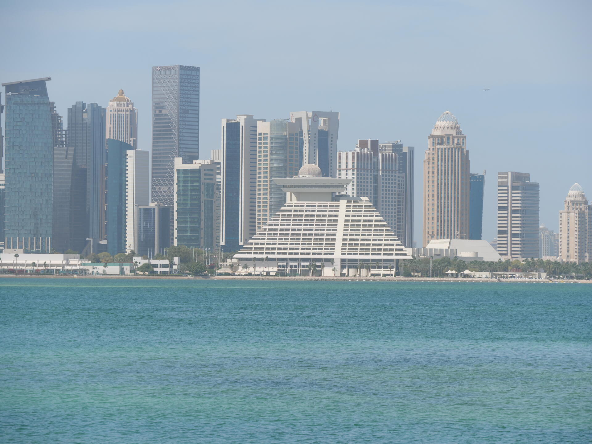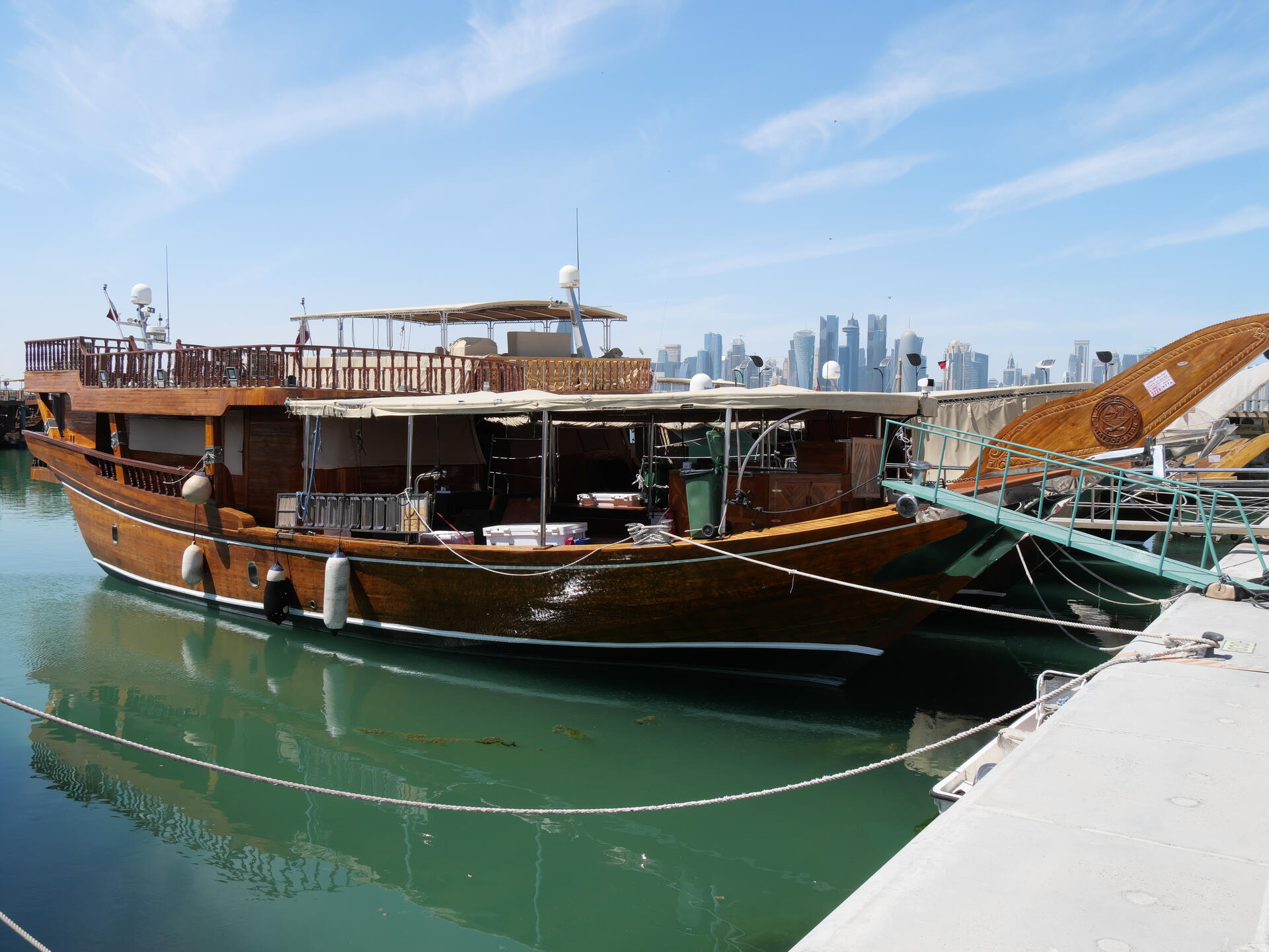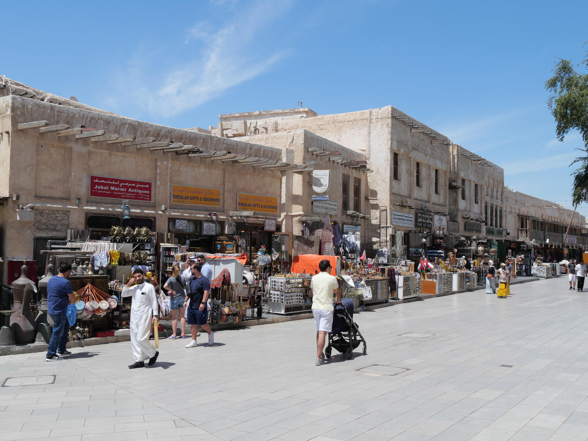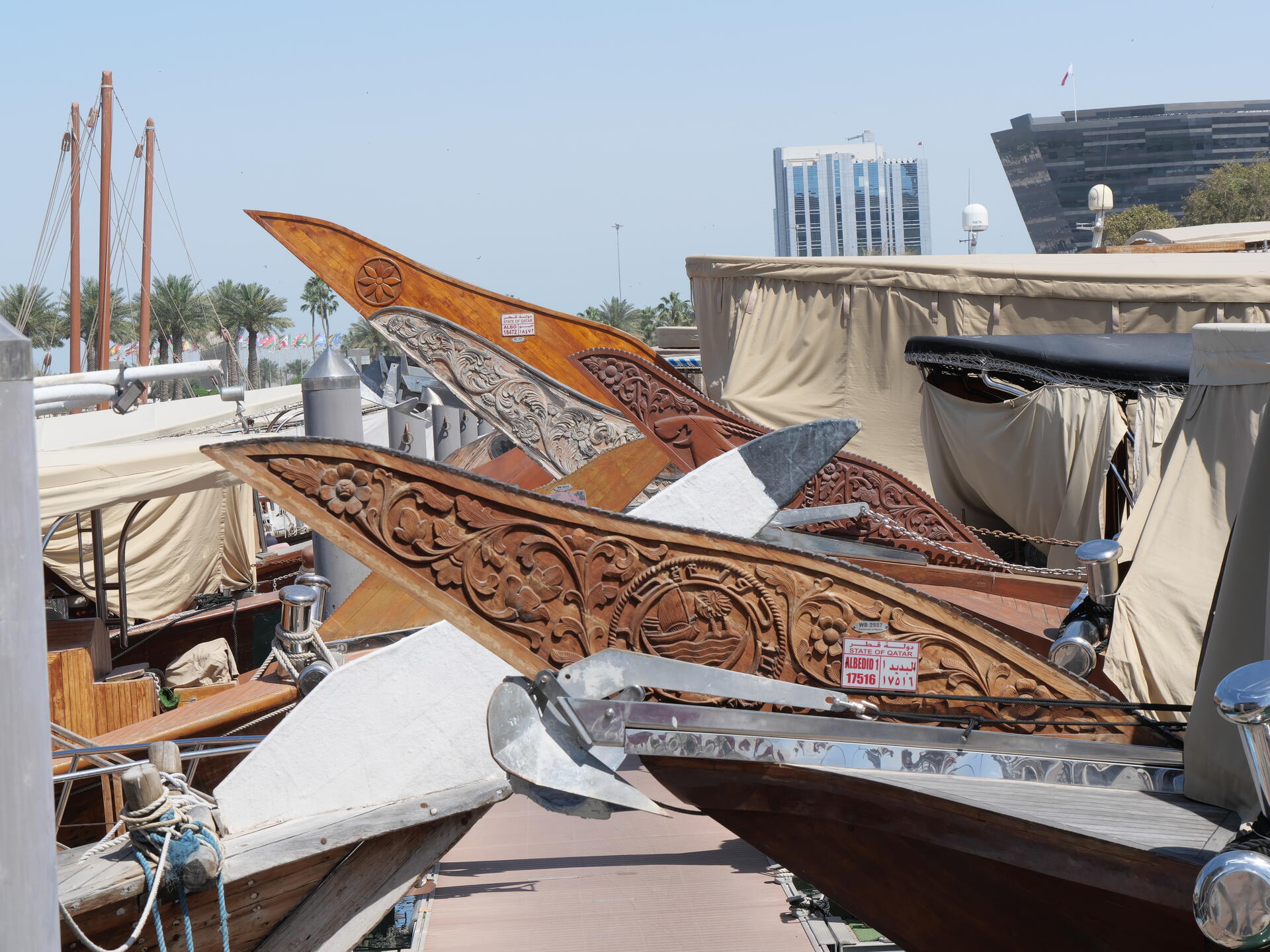 Nach einem arabischen Frühstück im Hotel besuchten wir den Souq Waqif. Wir können diesen riesigen traditionellen Markt zu Fuß erreichen. Neben traditioneller Kleidung werden u. a. auch Teppiche aus verschiedenen Ländern angeboten. Wir probierten Halva aus dem Oman sowie Weißen Kaffee gleichen Ursprungs. Immer wieder sind wir überrascht, wie freundlich und offen, aber auch wie stolz die Menschen auf ihr Land und ihre Kultur sind. Dabei werden wir das Bild von Nancy Faeser mit ihrer Regenbogenbinde zur Fußball-WM nicht los. Es bleibt uns noch immer unbegreiflich, mit welcher Arroganz und vermeintlichen moralischen Überheblichkeit sie Deutschland in Qatar repräsentiert hat. Im Anschluss gingen wir durch unglaublich saubere und klimatisierte Unterführungen bis zur sehr schön angelegten Uferpromenade, der Doha Corniche. Dort stießen wir auf ein kleines Hafenbecken, in dem viele großer Holzboote lagen. Wir vermuten, die Boote im traditionellen Stil werden für private Feiern gemietet. Auf der gegenüberliegenden Seite der türkisblauen Bucht liegt das Gebiet mit den Wolkenkratzern des kommerziellen Zentrums, welches sich durchaus mit dem von Singapur oder Dubai messen kann.