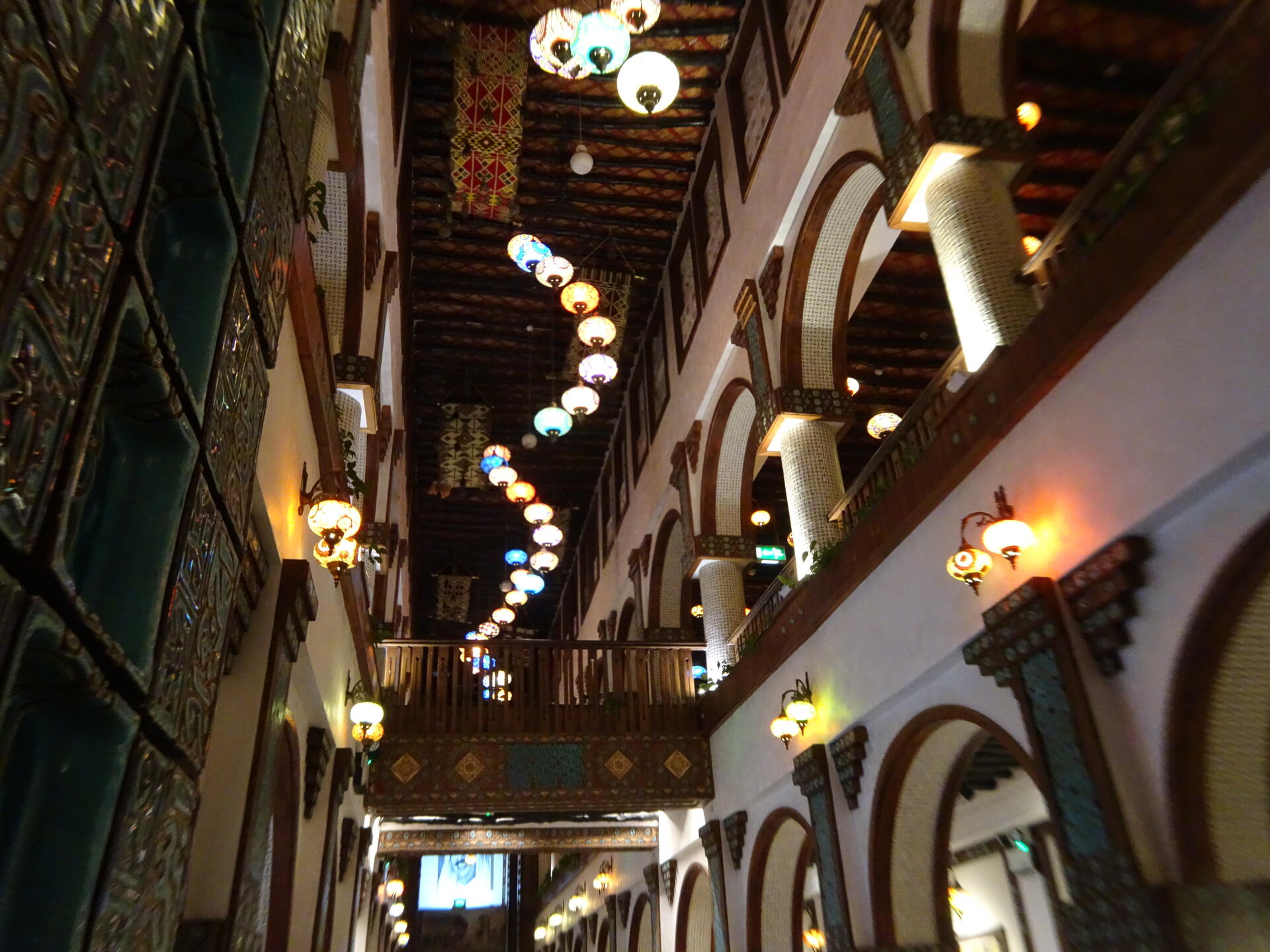 Am Nachmittag aßen wir in der Nähe unseres Hotels in einem kleinen arabischen Restaurant. Auf uns wirkt die arabische Küche ein wenig wie die türkische. Sie ist relativ fleischlastig, man isst als Beilage viel Reis. Gewürze werden viel dezenter eingesetzt als in Indien. Man kann es dennoch essen. Im Anschluss besuchten wir noch den großen Hof im Westen des Souqs. Die hohen Temperaturen des Tages waren abgeklungen und lockten viele Menschen ins Freie. Beinahe alle Lokale haben Tische und Stühle unter freiem Himmel, ein kleiner Abendmarkt mit kleinen Snacks und Kinderspielzeug sorgt unter sternklarem Himmel für eine schöne Atmosphäre. Bei nur sieben Regentagen im Jahr ist es nicht verwunderlich, dass sich abends der Schwerpunkt nach Draußen verlagert.