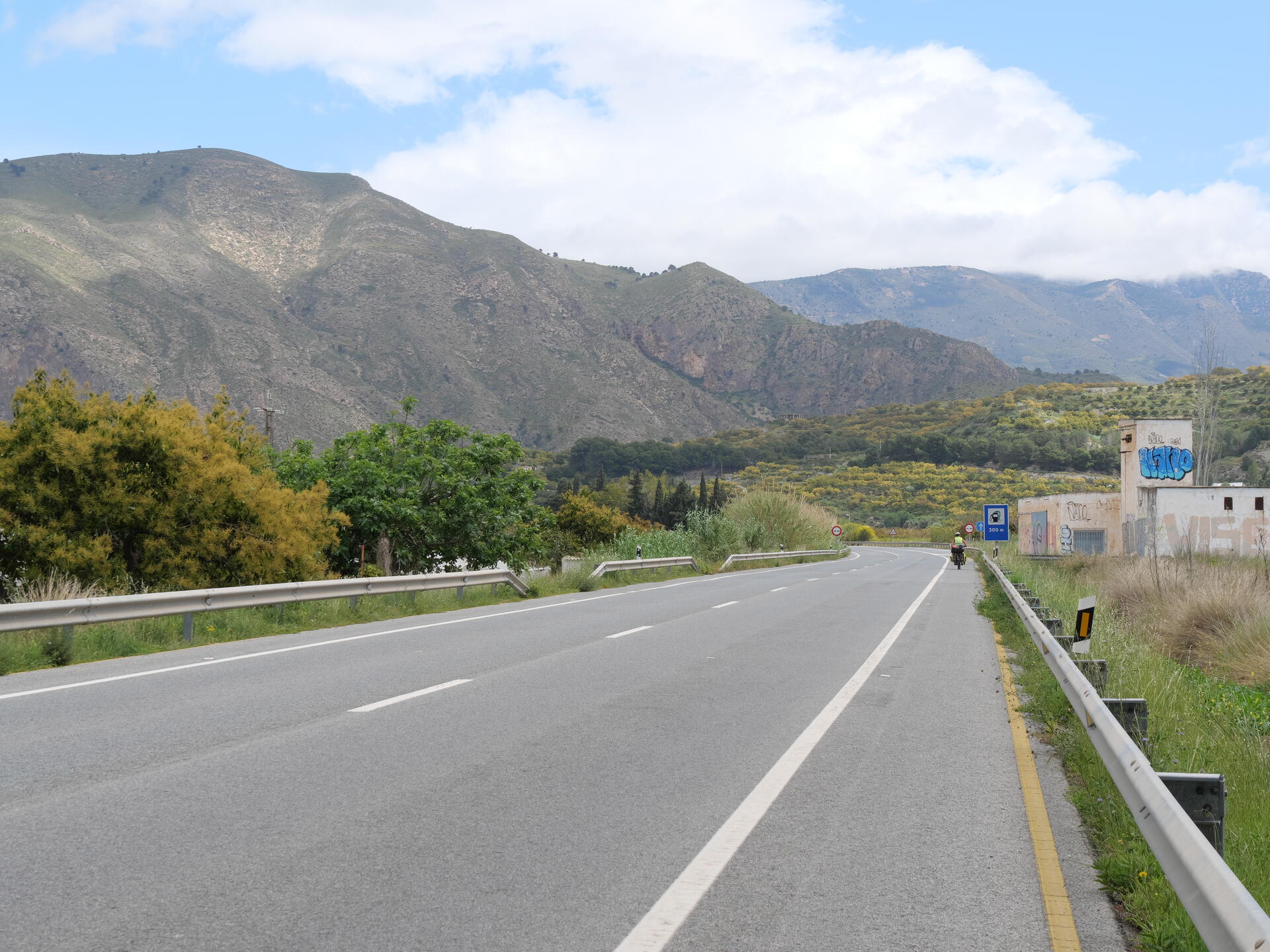 Heute Morgen war es endlich soweit. Gegen halb elf fuhren wir auf unseren Rädern in Almuñécar los. Wir waren trotz der mehr als sechsmonatigen Unterbrechung gut vorbereitet. Das Wetter war mit 14 Grad und frischem Wind nicht optimal, doch man kann nicht immer auf beste Bedingungen warten. Wir waren froh, dass es bis auf einen kurzen Schauer, den wir unter einem Baum etwa einen Kilometer vor unserem Ziel abwarteten, trocken blieb. Da wir die heutige und die folgende Unterkunft wegen der begrenzten Anzahl von Übernachtungsmöglichkeiten in dieser Gegend bereits vor längerer Zeit gebucht hatten, wären wir auch bei schlechterem Wetter gefahren. Bereits nach wenigen hundert Metern begann der erste Anstieg, der uns auf Betriebstemperatur brachte. Es lief besser als erwartet und doch waren wir froh, für heute eine kurze Etappe vor uns zu haben. Die Etappe hatten wir nicht wegen der Entfernung, sondern wegen der vom Planungsprogramm ausgewiesenen knapp 800 Höhenmeter begrenzt, was nach der langen Pause ausreichend erschien. Darauf, dass der Wert wir üblich deutlich über dem tatsächlichen liegt, wollten wir uns diesmal nicht verlassen.