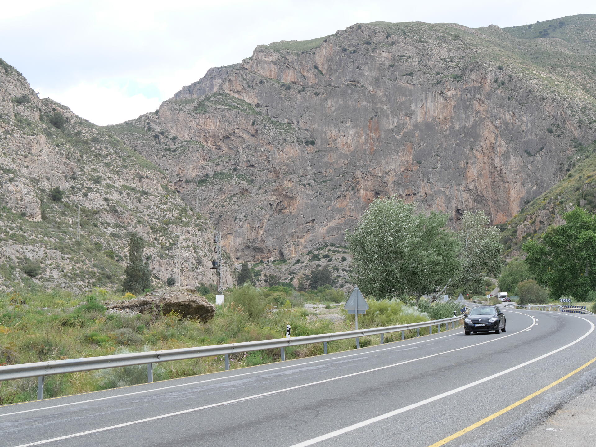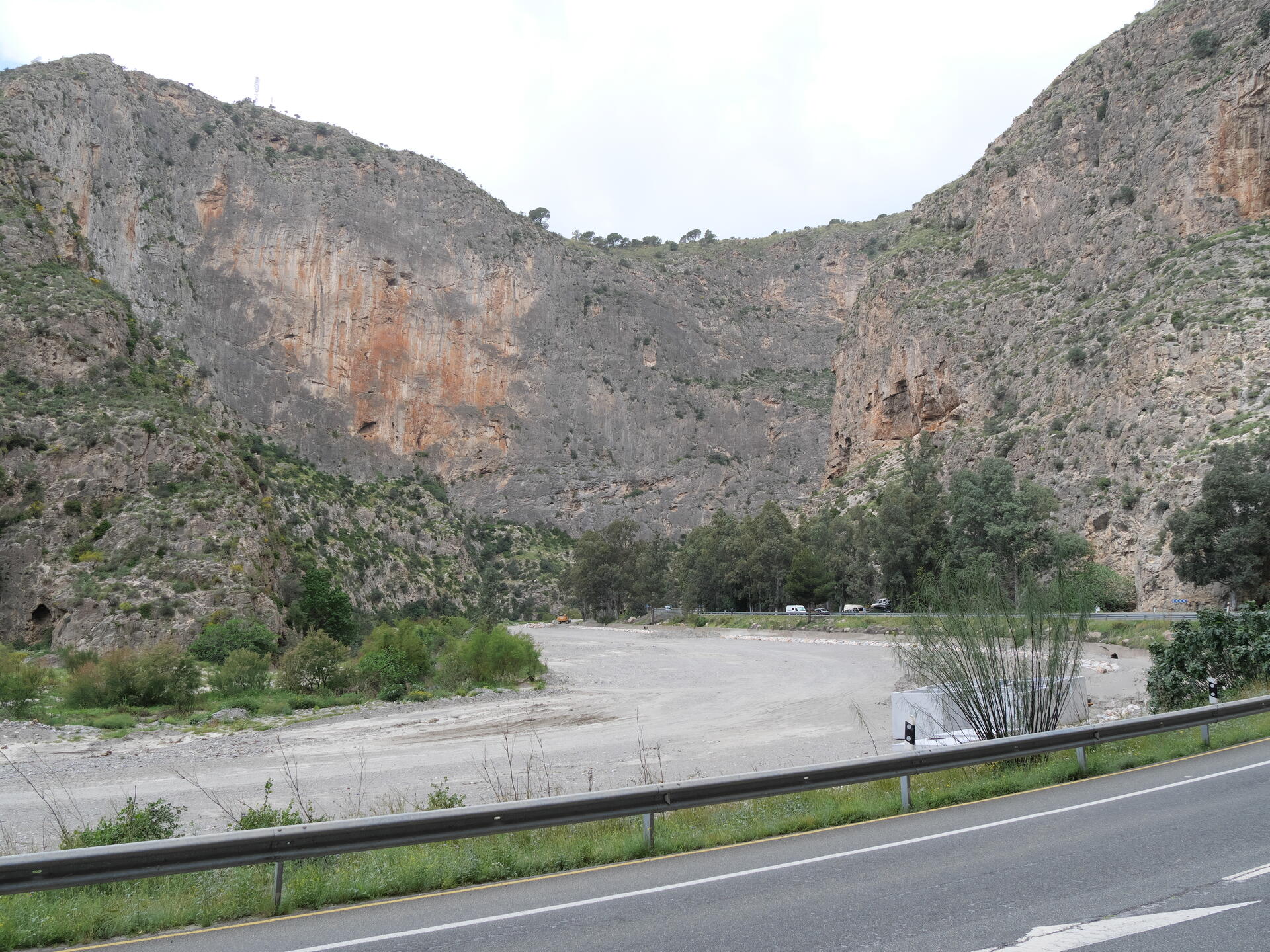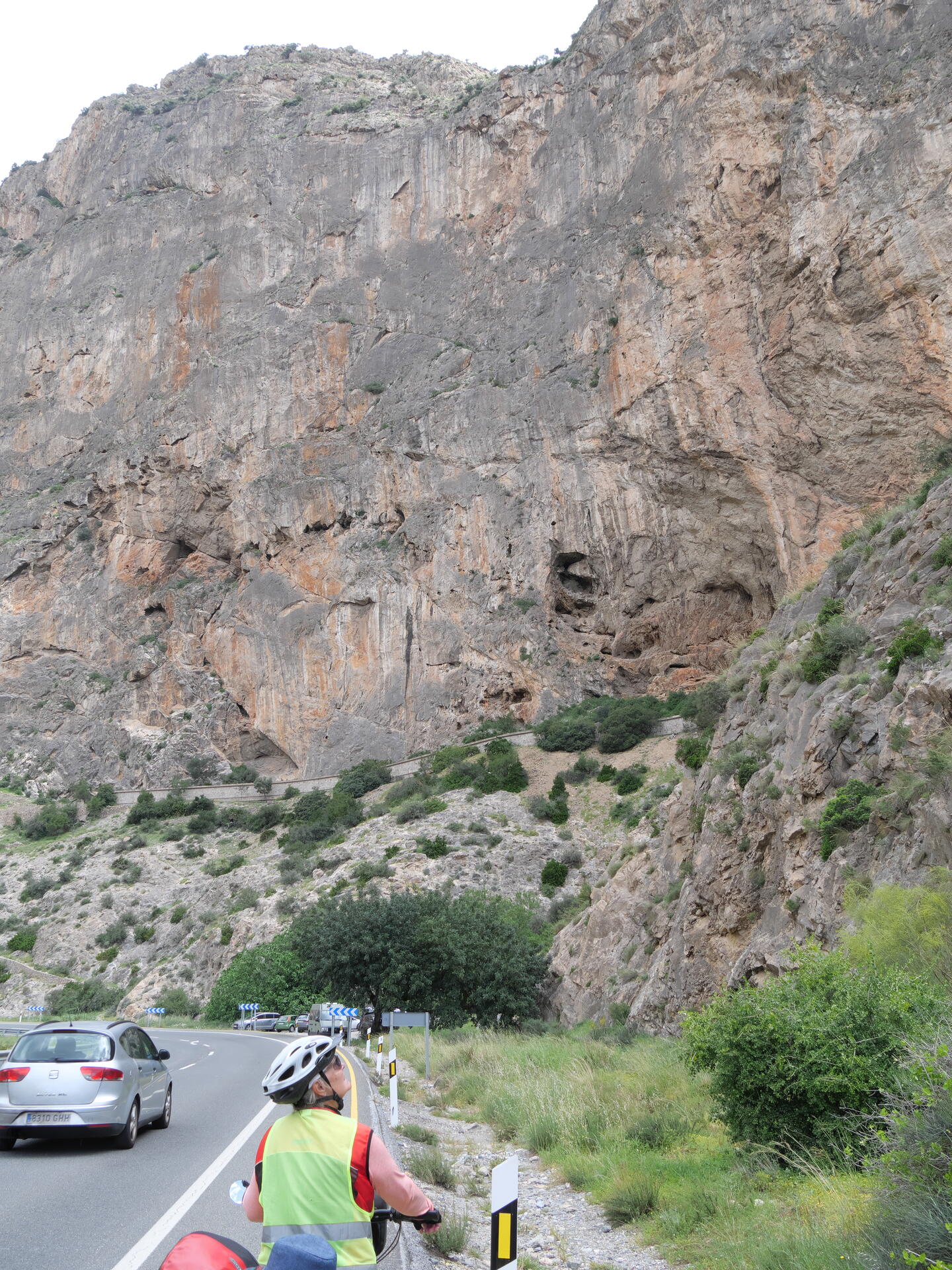 Wir fuhren bis kurz vor Motril die uns vom Hinweg bekannte Strecke, um dann nach Norden, Richtung Granada abzubiegen. Schnell erreichten wir die sich an den schmalen Küstenstreifen anschließenden Berge, die für Fahrradfahrer bedrohlich aussehen. Glücklicherweise hat der Río Guadalfeo sich tief in die Felsen eingeschnitten und wir konnten ohne schwere Steigungen seinem Lauf folgen. Die Wände der Schlucht erheben sich teilweise senkrecht. Viele Spanier nutzten den Ostersonntag zum Klettern.