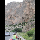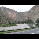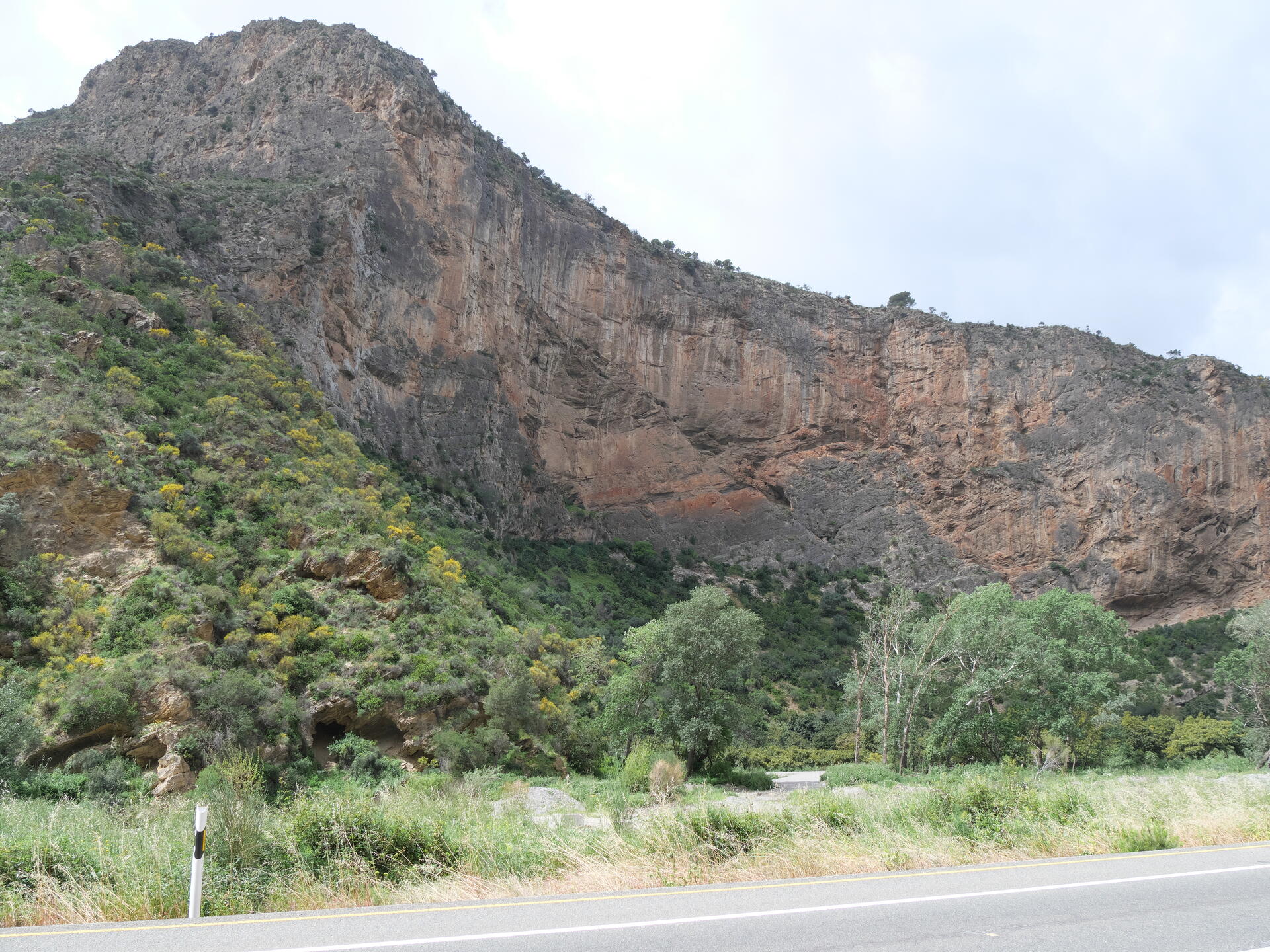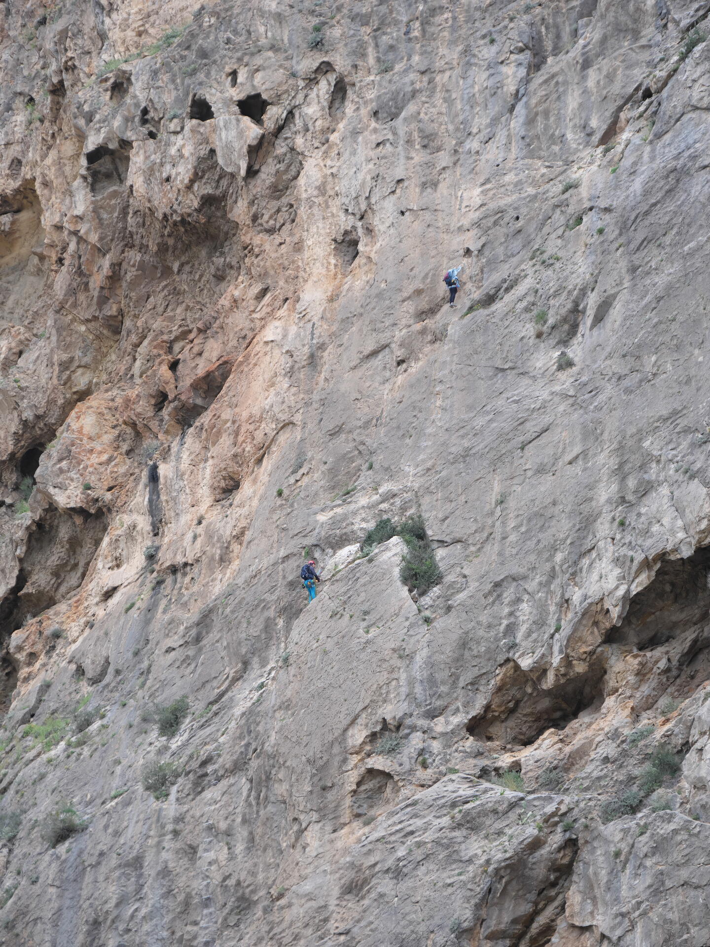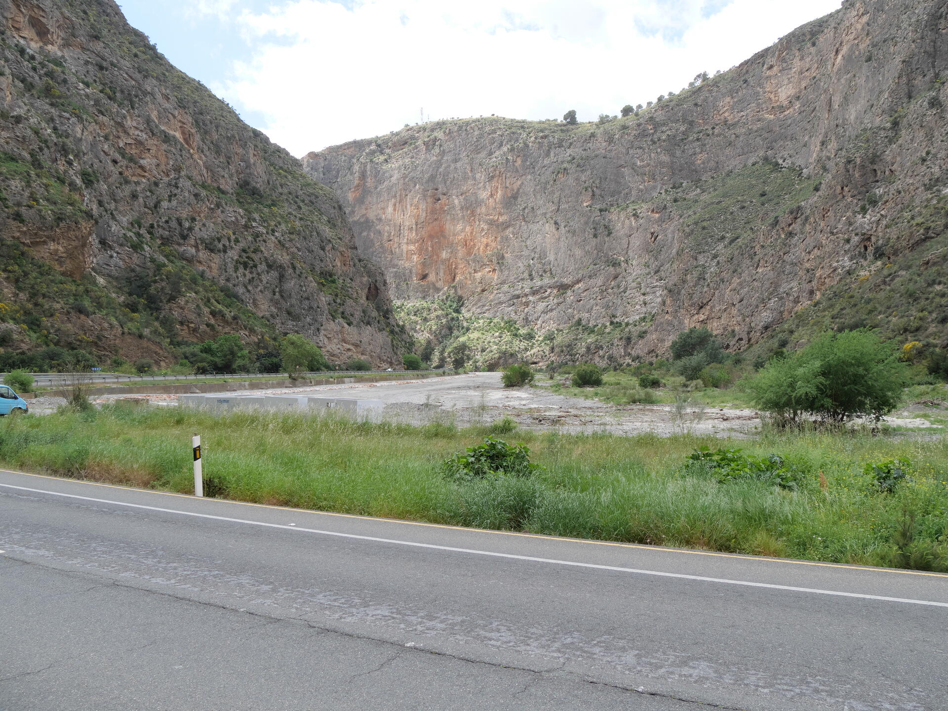 Wir fuhren bis kurz vor Motril die uns vom Hinweg bekannte Strecke, um dann nach Norden, Richtung Granada abzubiegen. Schnell erreichten wir die sich an den schmalen Küstenstreifen anschließenden Berge, die für Fahrradfahrer bedrohlich aussehen. Glücklicherweise hat der Río Guadalfeo sich tief in die Felsen eingeschnitten und wir konnten ohne schwere Steigungen seinem Lauf folgen. Die Wände der Schlucht erheben sich teilweise senkrecht. Viele Spanier nutzten den Ostersonntag zum Klettern.