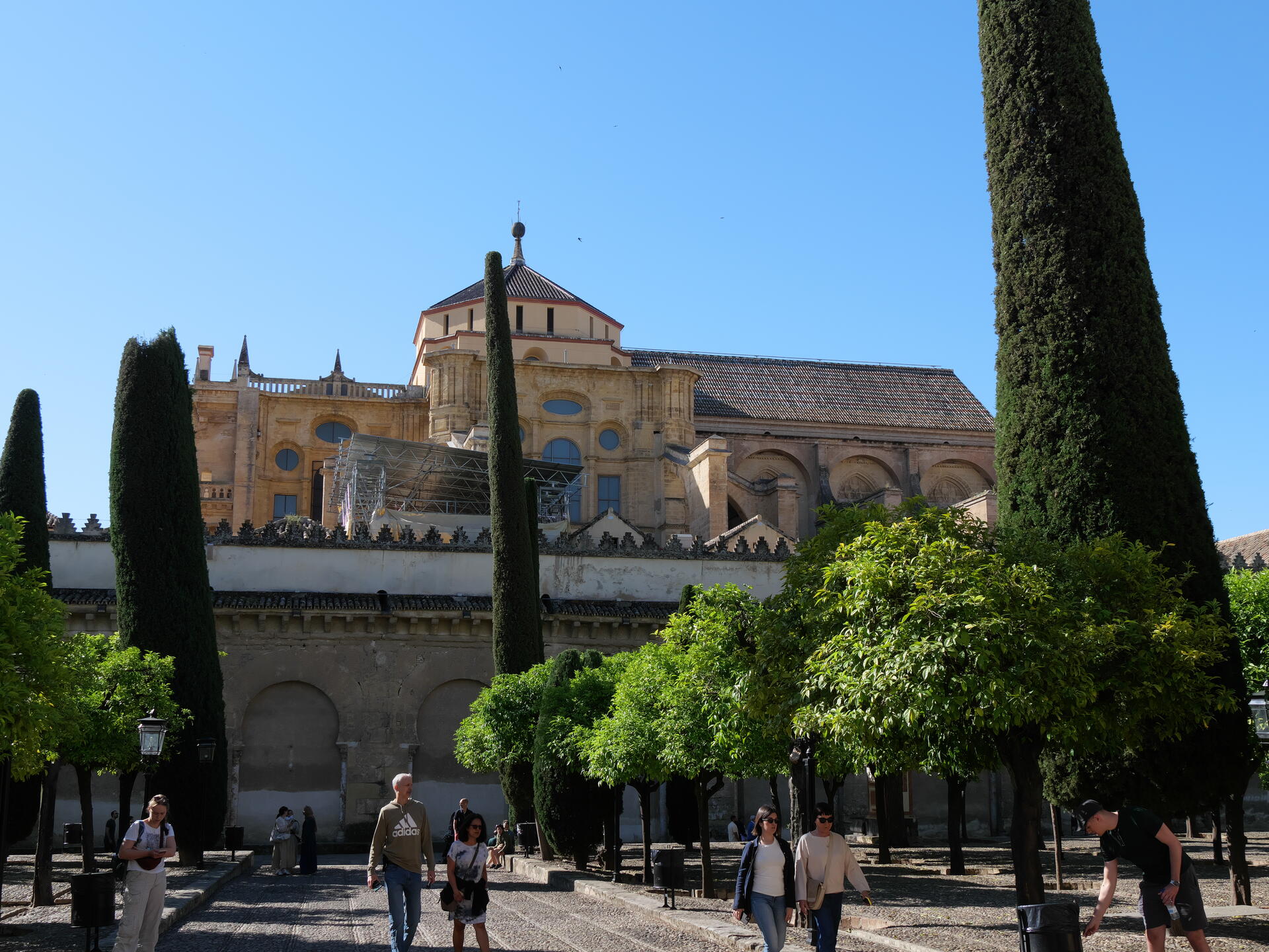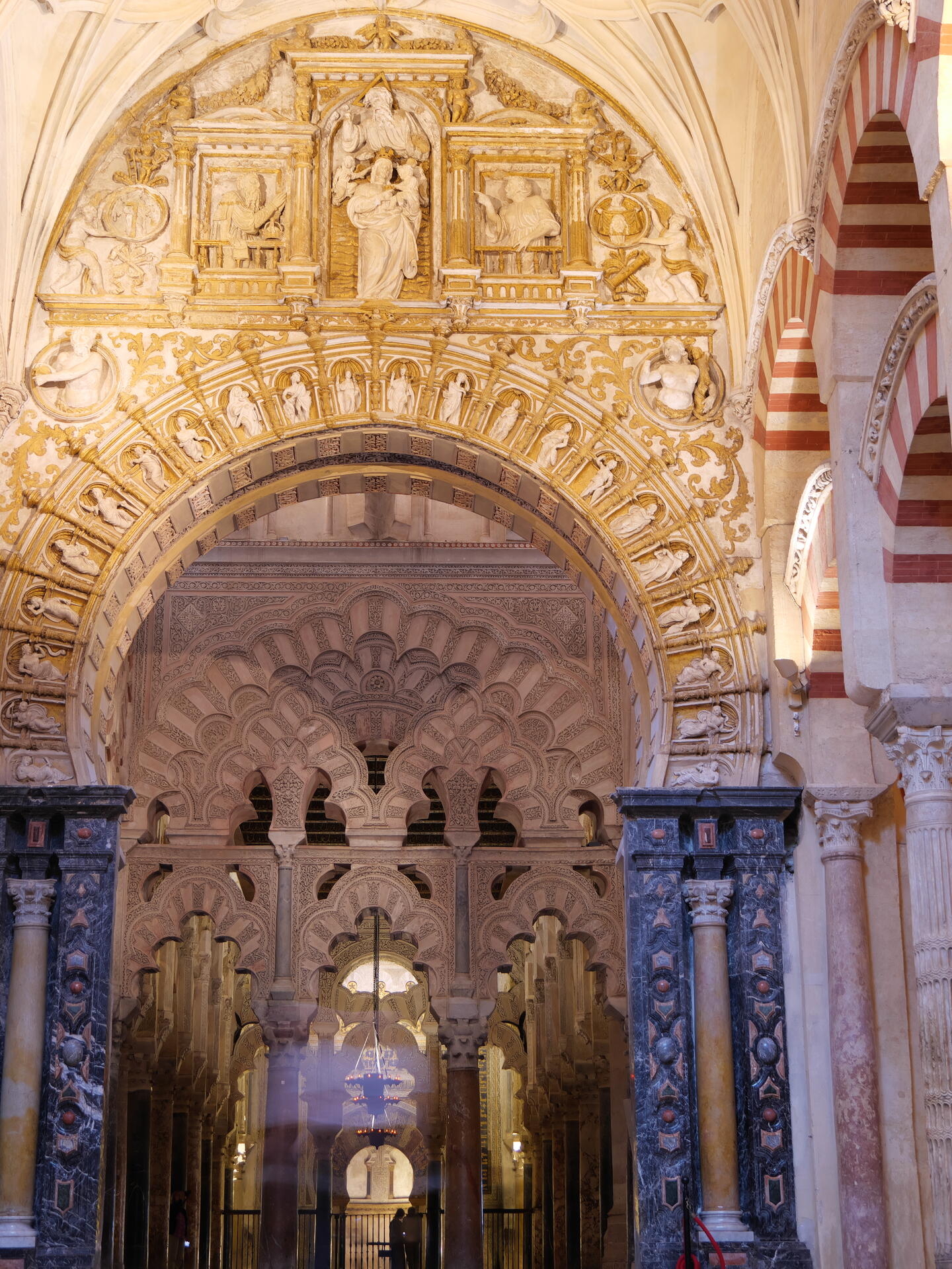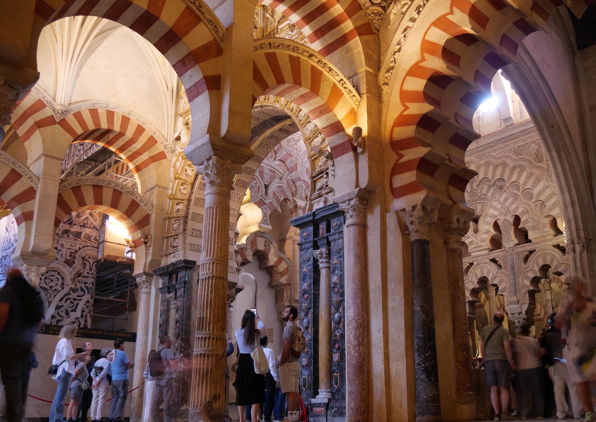 Mit unseren online vorbestellen Karten besuchten wir heute Morgen ab 9 Uhr die Moschee-Kathedrale von Córdoba. Die wechselvolle Geschichte der Stadt Córdoba spiegelt sich auf eindrucksvolle Weise in diesem großartigen Bauwerk wider. Die ursprüngliche Moschee, mit deren Bau 784 begonnen wurde und die nach der Vertreibung der Mauren im Jahr 1236 in eine christliche Kirche umgewandelt wurde, beeindruckt durch ihre Größe. Getragen von 856 Säulen, die aus Jaspis, Onyx, Marmor und Granit bestehen, präsentiert sie sich heute als Verschmelzung von islamischer Ästhetik und katholischem Prunk. In stündlichem Abstand wurden die jeweils nächsten Besucherkontingente eingelassen, worunter die Stimmung litt. Nicht alle verhalten sich der Bedeutung des Ortes angemessen und wir waren froh, den frühen Termin gewählt zu haben.