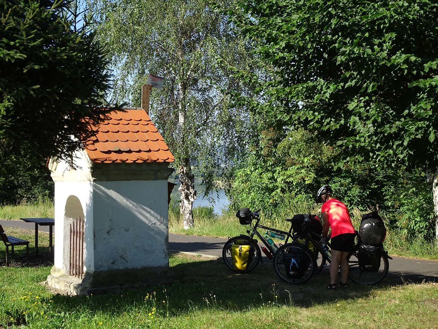 Nachdem sich das Wetter wieder stabilisiert hatte, setzten wir unsere Fahrt auf dem Elbe-/Labe-Radweg fort und erreichten den Ort Roudnice nad Labem. Wenige Kilometer vor unserem Ziel öffnet sich das enge Elbetal zu einer weiten Ebene. Unser Weg verlief noch etwas weiter auf einem Hügelkamm und erlaubte uns dadurch Ausblicke weit ins Land. Roudnice ist wieder ein kleiner Ort mit einer geschichtsträchtigen Vergangenheit und besticht mit einem ansprechend restaurierten Altstadtkern und seiner beeindruckenden Lage an der Elbe.
